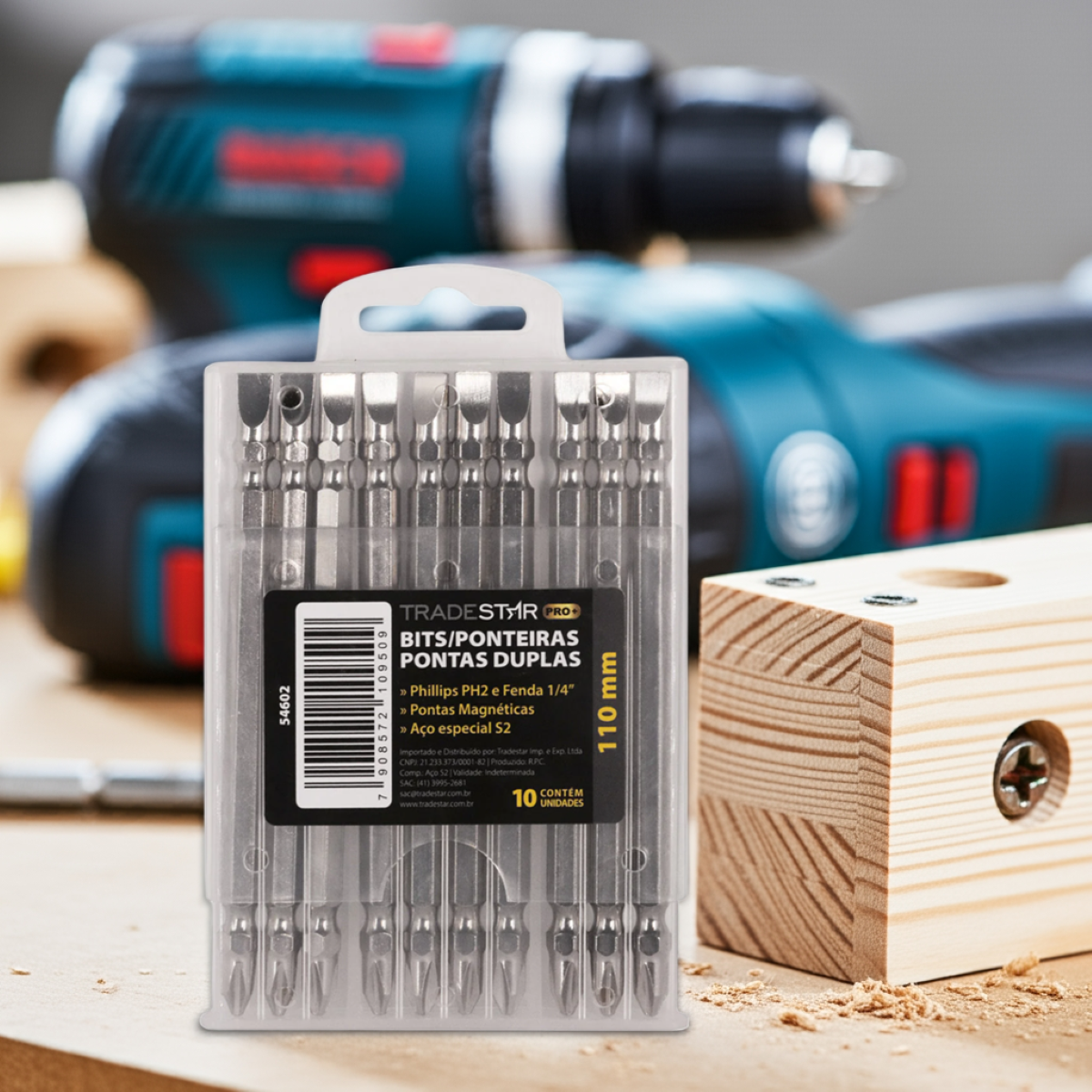 Bits Ponteira Dupla Tradestar 110mm PH2 1/4" Philips Fenda ProO Jogo de Bits Ponteira Dupla Tradestar 110mm PH2 1/4" foi desenvolvido para oferecer praticidade, resistência e alto desempenho em trabalhos que exigem precisão e eficiência. Seja em marcenaria, carpintaria ou construção civil, esse kit é a solução ideal para profissionais que buscam ferramentas duráveis e de fácil utilização em suas atividades diárias.Produzido em aço S2, material de referência no segmento de ferramentas pela sua alta resistência ao desgaste e durabilidade, este conjunto garante uma vida útil prolongada, mesmo em aplicações intensivas. Cada bit conta com uma ponta dupla, oferecendo a versatilidade necessária para trabalhar tanto com parafusos Phillips (PH2) quanto com parafusos de fenda, otimizando o tempo e reduzindo a necessidade de troca frequente de ponteiras.Com 110mm de comprimento, os bits proporcionam maior alcance, permitindo acesso a locais de difícil manuseio e aumentando a eficiência do trabalho em superfícies profundas ou de acesso limitado. Além disso, a ponta imantada assegura maior firmeza na fixação dos parafusos, evitando quedas, escorregões e proporcionando uma experiência de uso mais segura e produtiva.Outro diferencial importante é o encaixe sextavado universal de 1/4", compatível com a maioria das parafusadeiras elétricas disponíveis no mercado. Isso garante ampla aplicabilidade, seja para pequenos reparos, projetos de bricolagem ou demandas profissionais em ambientes mais exigentes.Graças ao design inteligente e à qualidade de fabricação Tradestar, este kit oferece precisão no encaixe, evitando danos tanto ao bit quanto ao parafuso, e promovendo maior eficiência em cada tarefa. Uma escolha indispensável para quem deseja aumentar a produtividade com ferramentas confiáveis, resistentes e de alto desempenho.Especificações- Modelo: Bits Ponteira Dupla Tradestar Pro- Tipo: Philips/Fenda (PH2)- Comprimento: 110mm- Encaixe: 1/4" sextavado universal- Material: Aço S2 (alta resistência e durabilidade)- Pontas: ImantadasItens inclusos- 1 Jogo Bits Duplo Fenda/Phillips Ph2-1/4" 110 mm 10 Peças S2 ProGarantia- 03 meses com o Fabricante