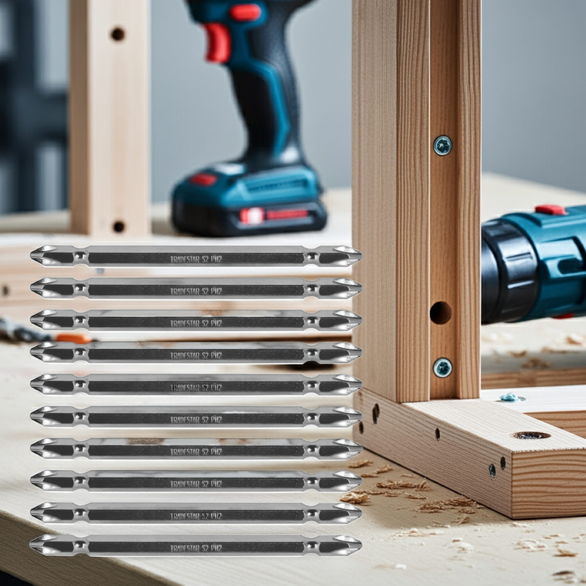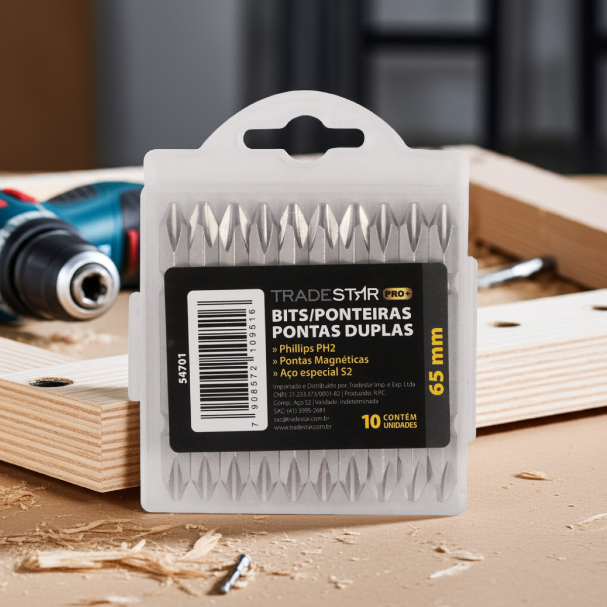 Bits Ponteira Dupla Tradestar 110 mm Ph2 Philips ImantadaO Jogo de Bits Ponteira Dupla Tradestar 110 mm PH2 foi desenvolvido para profissionais que precisam de alcance estendido e precisão em cada parafusamento. Fabricados em aço S2 de alta resistência, esses bits suportam uso contínuo em montagem, construção civil, manutenção e trabalhos industriais, oferecendo durabilidade e performance superiores mesmo em operações frequentes.Com ponta PH2 em ambas as extremidades e imantação, os bits garantem encaixe firme e seguro em parafusos, evitando que eles escorreguem durante o trabalho. Ideais para parafusadeiras elétricas e manuais, proporcionam maior agilidade e precisão, especialmente em locais de difícil acesso ou em tarefas que exigem maior alcance.Projetados para profissionais de marcenaria, carpintaria, manutenção predial e indústria, esses bits combinam resistência, eficiência e versatilidade, garantindo resultados confiáveis em cada projeto, seja ele doméstico ou profissional.Este kit de bits é a ferramenta ideal para profissionais que exigem precisão, resistência e agilidade em cada operação. Um investimento que transforma tarefas complexas em trabalhos rápidos e confiáveis, aumentando produtividade e segurança no dia a dia.Especificações- Comprimento: 110 mm- Ponta: PH2 em ambas as extremidades- Material: Aço S2 de alta resistência- Imantado: Sim, para maior aderência e precisão- Aplicações: Ideal para parafusadeiras elétricas e manuaisItens inclusos- 1 Jogo Bits Duplo Ph2-Ph2 110 mm 10 Peças S2 ProGarantia- 03 meses com o Fabricante