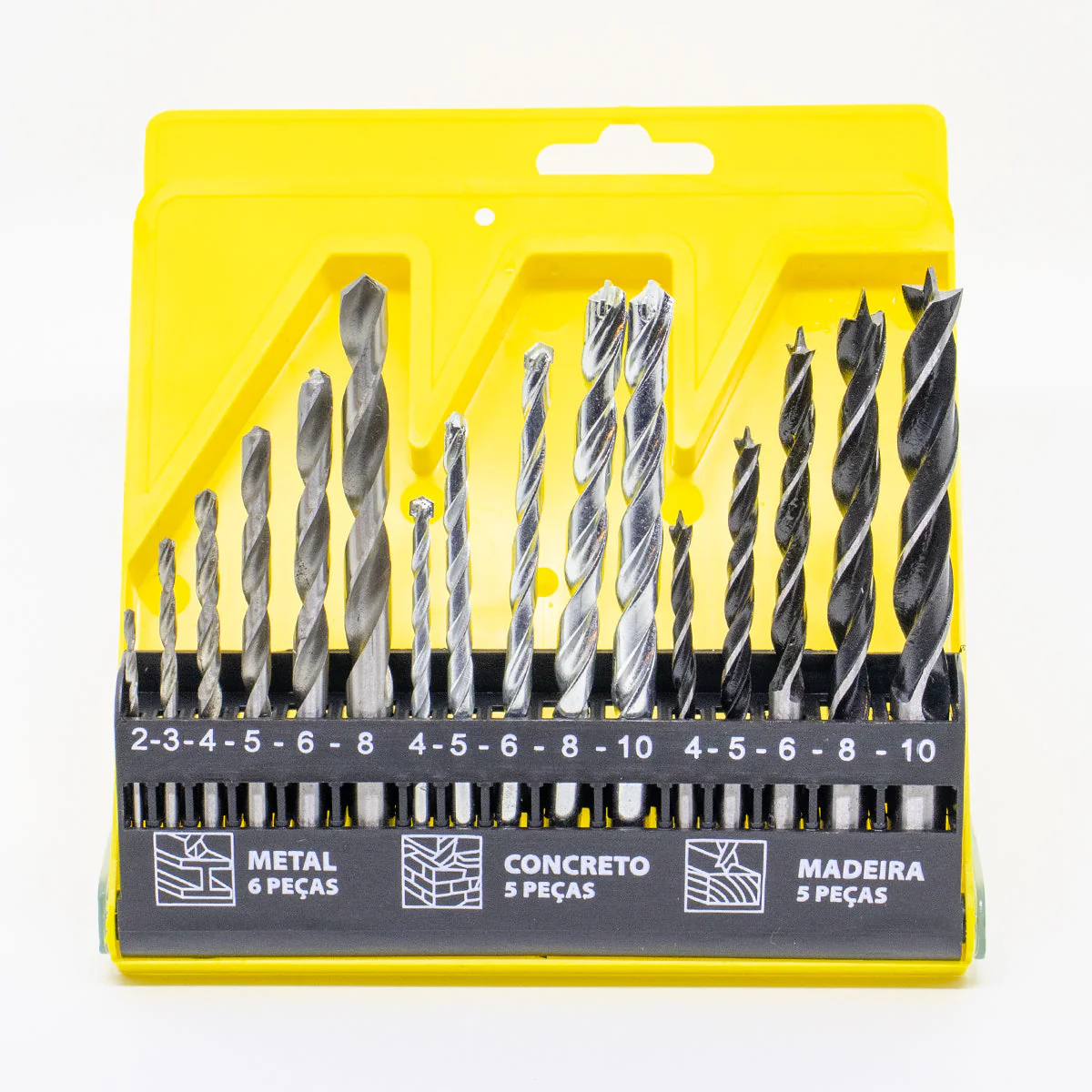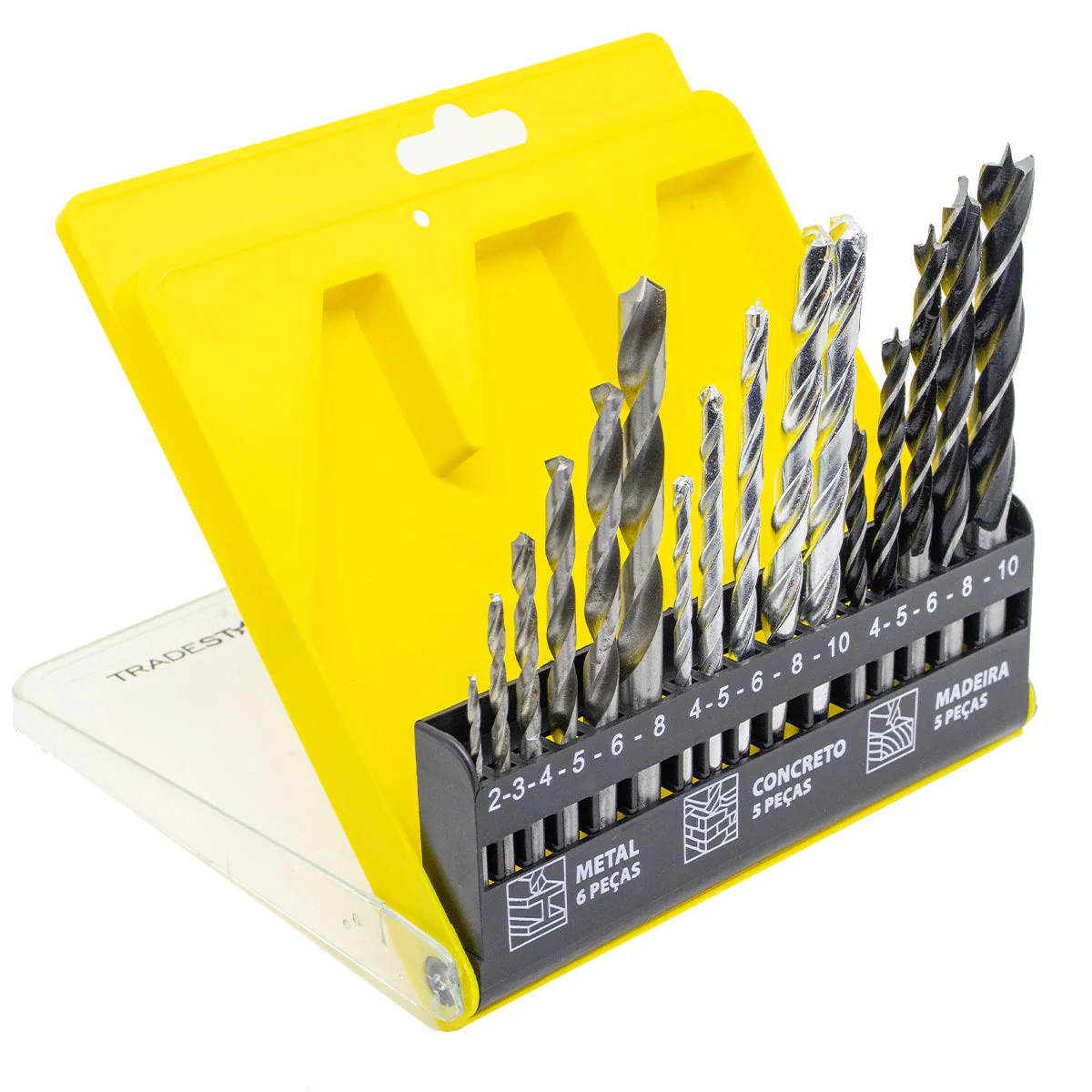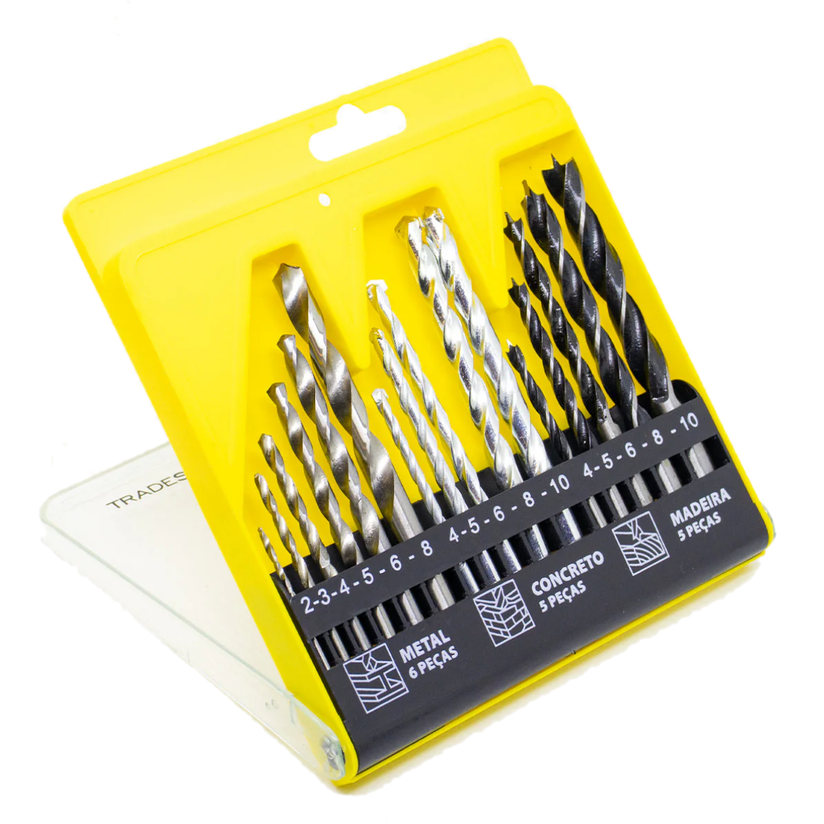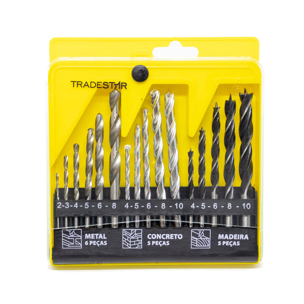 Jogo de Brocass Tradestar Concreto Madeira Metal 16 PeçasO Jogo de Brocas Tradestar 16 Peças foi desenvolvido para oferecer praticidade e versatilidade em um único kit. Composto por brocas específicas para metal, concreto e madeira, ele é ideal para quem busca uma solução completa para trabalhos de perfuração em diferentes materiais.As brocas para metal são fabricadas em aço de alta resistência, garantindo cortes precisos em metais ferrosos e não ferrosos. Já as brocas para concreto possuem ponta de vídea, proporcionando maior durabilidade e eficiência em alvenaria e superfícies rígidas. As brocas para madeira, por sua vez, possuem design que favorece a retirada de cavacos, assegurando perfurações limpas e rápidas.Todo o conjunto vem acondicionado em um estojo plástico resistente, que facilita o transporte, organização e armazenamento das peças. Assim, você terá sempre a ferramenta certa para cada tipo de aplicação, seja em obras, manutenções, montagens ou reparos domésticos.Especificações- Brocas para metal (aço): 2 mm, 3 mm, 4 mm, 5 mm, 6 mm e 8 mm- Brocas para concreto (ponta vídea): 4 mm, 5 mm, 6 mm, 8 mm e 10 mm- Brocas para madeira (helicoidais): 4 mm, 5 mm, 6 mm, 8 mm e 10 mm- Acondicionamento: Estojo plástico resistente- Indicação de uso: Perfurações em metal, concreto, alvenaria, madeira e derivadosItens inclusos- 1 Jogo Broca Mix Concreto/Madeira/Metal 16 PeçasGarantia- 03 meses com o Fabricante