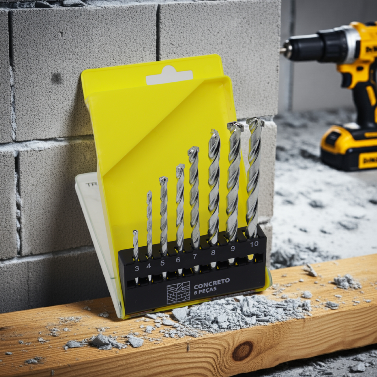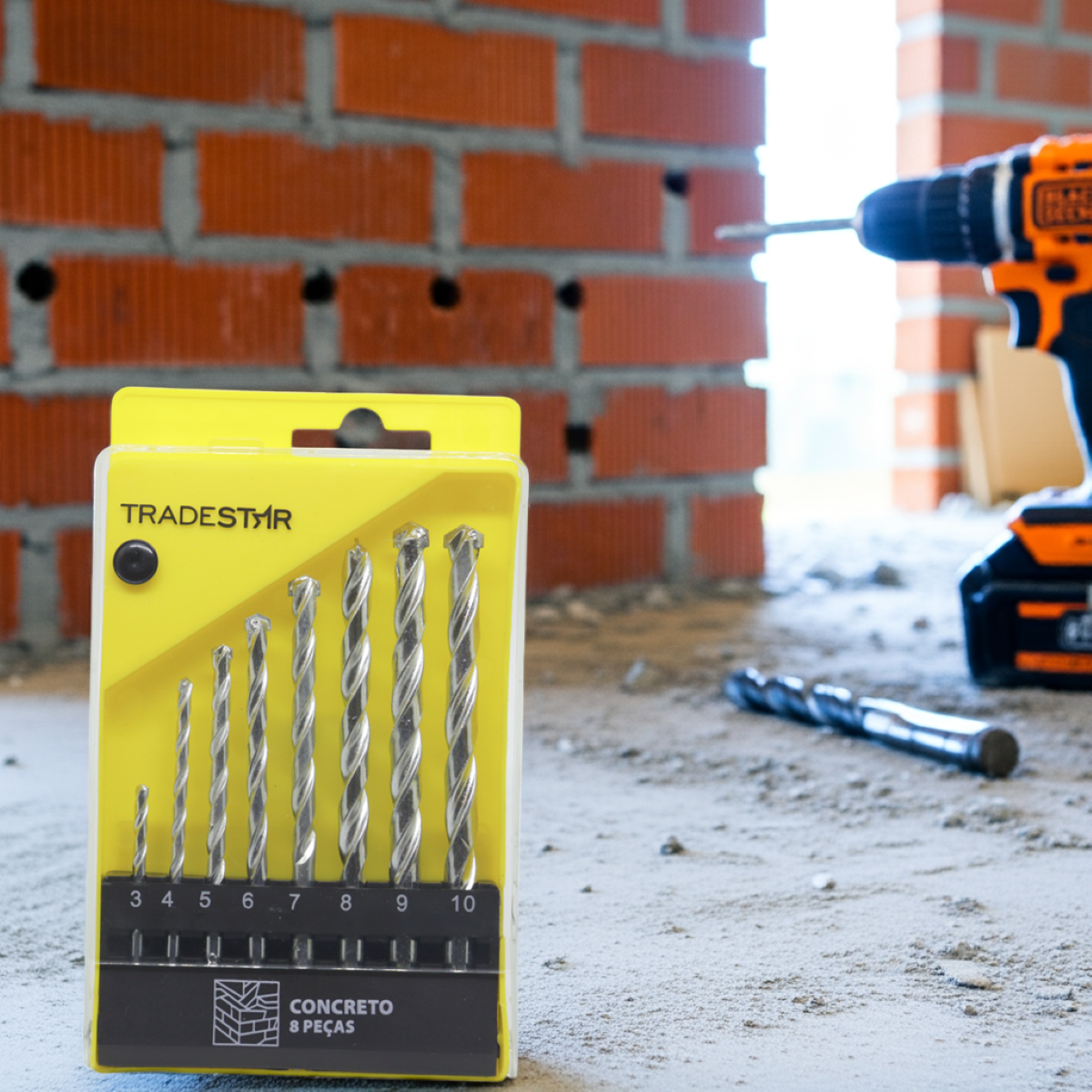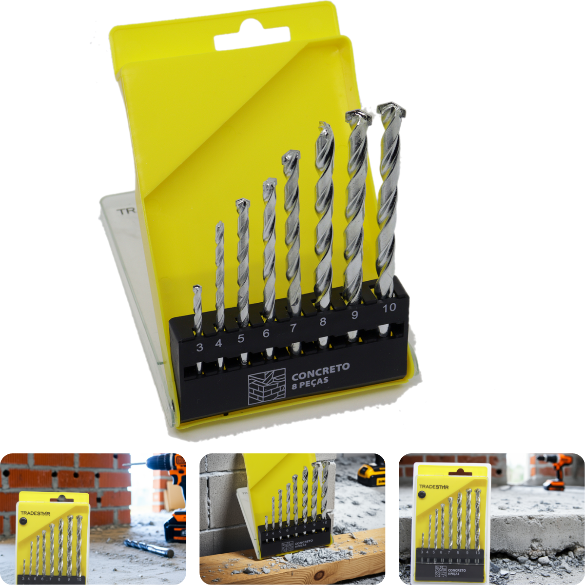 Jogo Broca Concreto Tradestar 3 mm até 10 mm Vídea 8 PeçasO Jogo de Brocas Tradestar 16 Peças foi desenvolvido para oferecer praticidade e versatilidade em um único kit. Composto por brocas específicas para metal, concreto e madeira, ele é ideal para quem busca uma solução completa para trabalhos de perfuração em diferentes materiais.As brocas para metal são fabricadas em aço de alta resistência, garantindo cortes precisos em metais ferrosos e não ferrosos. Já as brocas para concreto possuem ponta de vídea, proporcionando maior durabilidade e eficiência em alvenaria e superfícies rígidas. As brocas para madeira, por sua vez, possuem design que favorece a retirada de cavacos, assegurando perfurações limpas e rápidas.Todo o conjunto vem acondicionado em um estojo plástico resistente, que facilita o transporte, organização e armazenamento das peças. Assim, você terá sempre a ferramenta certa para cada tipo de aplicação, seja em obras, manutenções, montagens ou reparos domésticos.Especificações- Brocas para metal (aço): 2 mm, 3 mm, 4 mm, 5 mm, 6 mm e 8 mm- Brocas para concreto (ponta vídea): 4 mm, 5 mm, 6 mm, 8 mm e 10 mm- Brocas para madeira (helicoidais): 4 mm, 5 mm, 6 mm, 8 mm e 10 mm- Acondicionamento: Estojo plástico resistenteItens inclusos- 1 Jogo Broca para Concreto 3-10 mm Videa 8 PeçasGarantia- 03 meses com o Fabricante