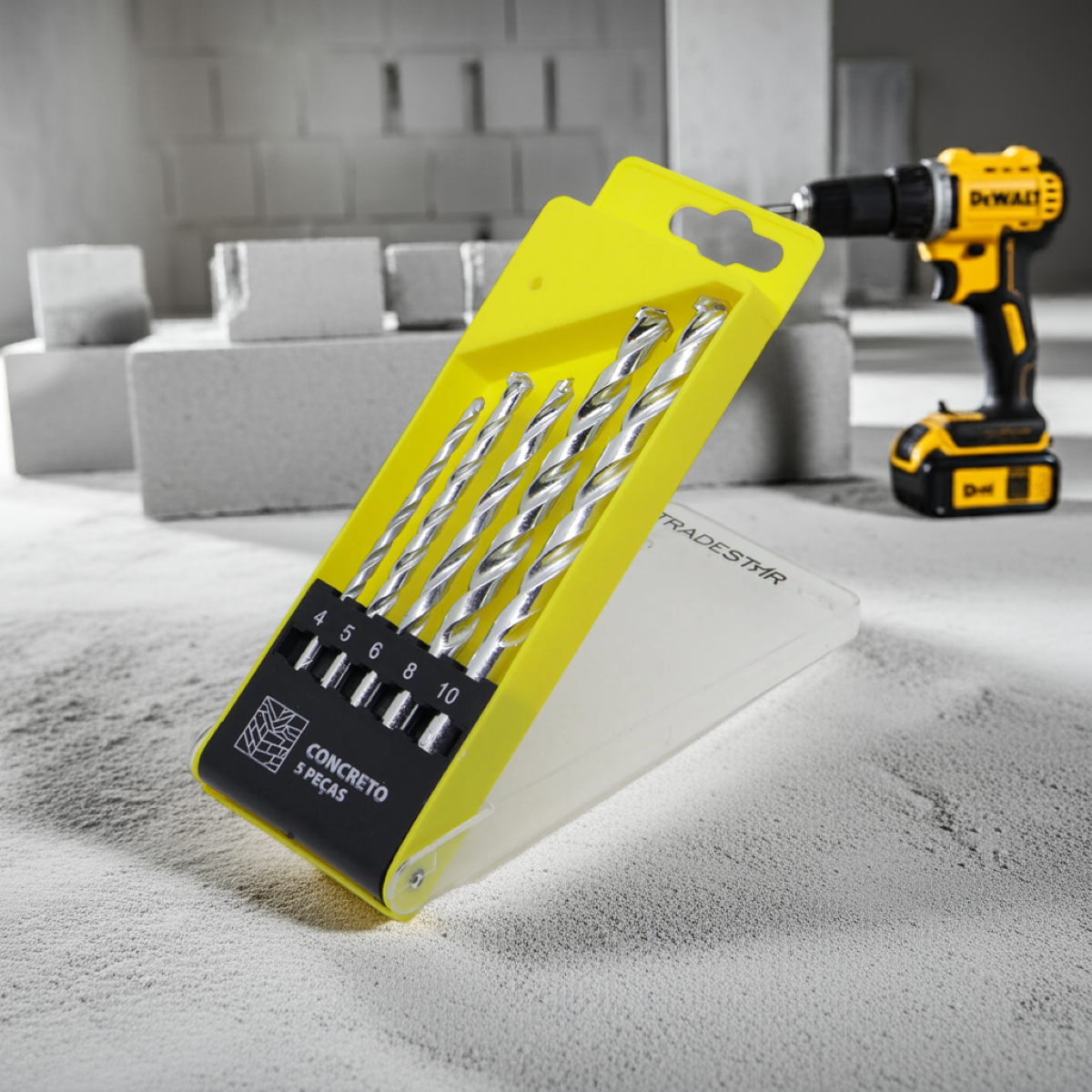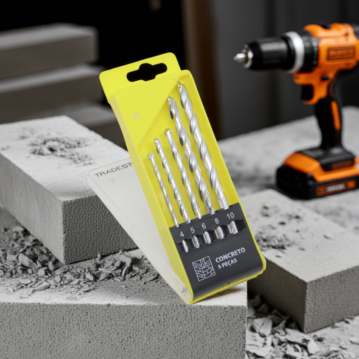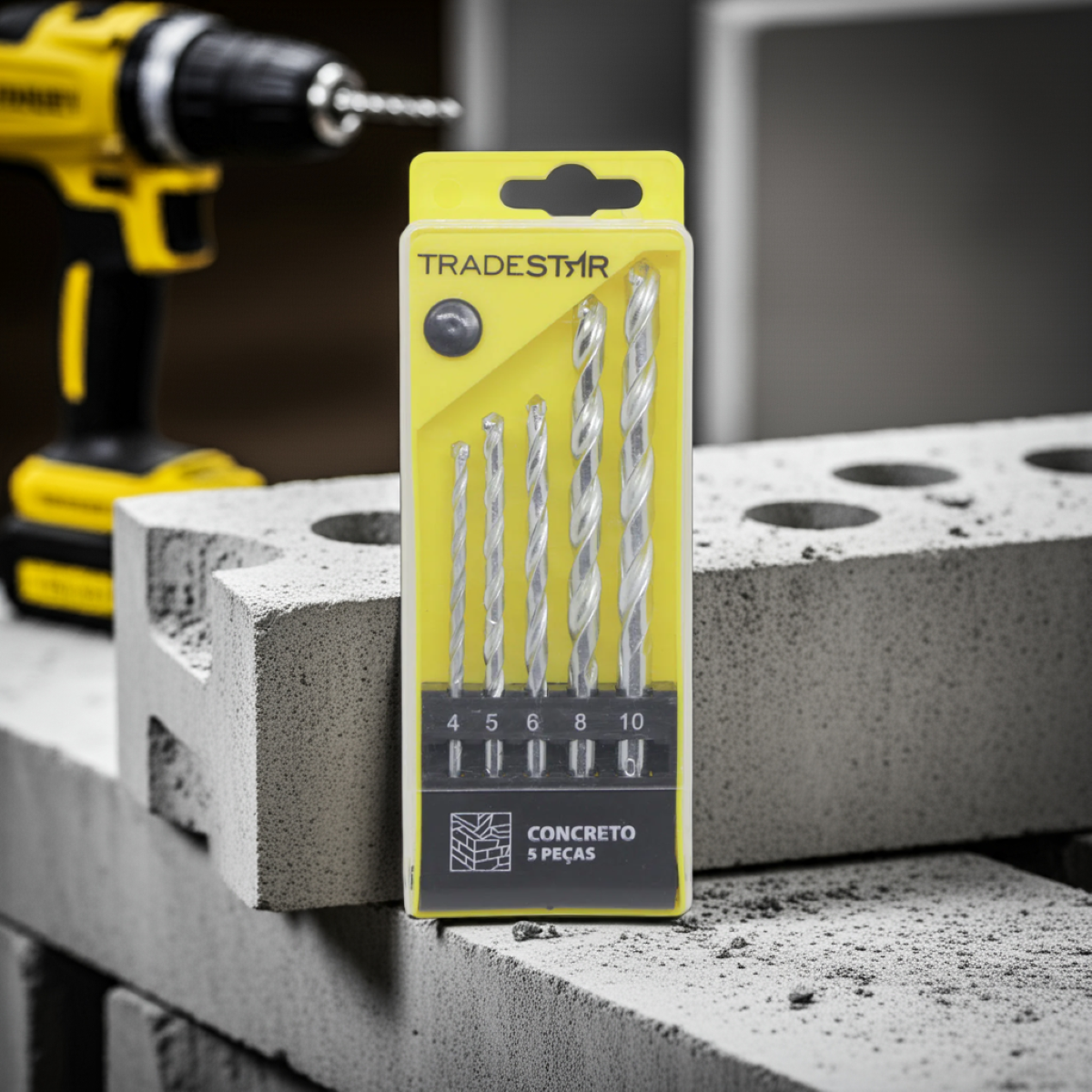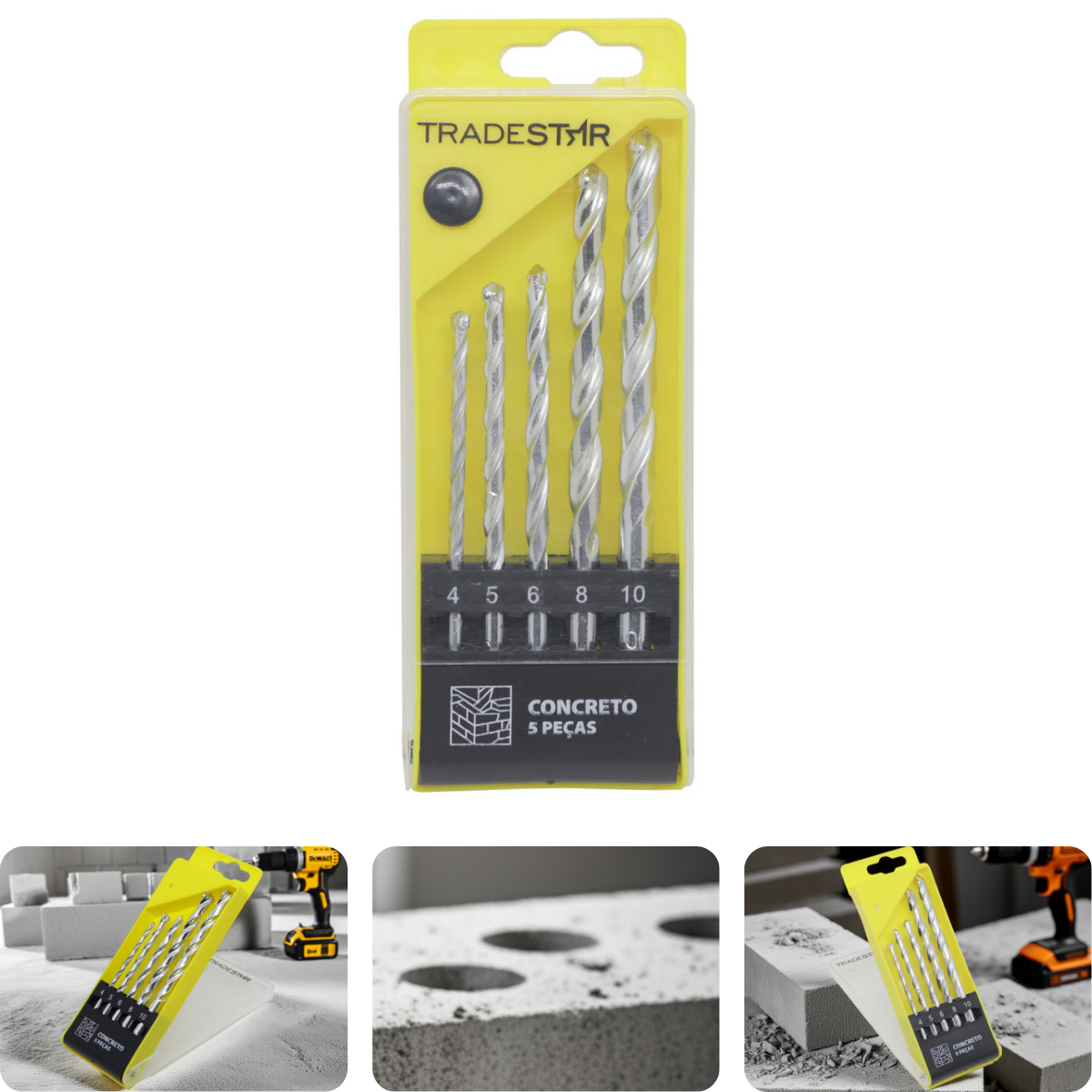Jogo Broca Tradestar Concreto 4 até 10 mm Vídea 5 PeçasO Jogo de Brocas Tradestar para Concreto foi desenvolvido para quem exige força, durabilidade e precisão em trabalhos profissionais e domésticos. Fabricadas em aço carbono de alta qualidade com ponta de vídea, essas brocas são ideais para enfrentar superfícies rígidas como concreto, alvenaria, tijolos e blocos cerâmicos, proporcionando perfurações limpas e seguras.Graças ao seu design helicoidal, as brocas garantem ótima remoção de resíduos, evitando travamentos durante o uso e aumentando a eficiência a cada perfuração. Além disso, a ponta de vídea assegura maior resistência ao desgaste, permitindo que você execute múltiplas tarefas sem perder o corte.Este kit acompanha 5 tamanhos diferentes (4, 5, 6, 8 e 10 mm), oferecendo versatilidade para diversas aplicações, desde pequenas instalações até trabalhos mais pesados em obras. Para completar, as peças vêm acondicionadas em um estojo plástico resistente, que facilita o transporte, a organização e mantém suas ferramentas sempre protegidas e prontas para o uso.Seja para uso em oficinas, construções, reformas ou pequenos reparos em casa, o Jogo de Brocas Tradestar para Concreto é um aliado indispensável para quem busca resultado profissional com praticidade e confiança.Especificações- Tamanhos (diâmetros): 4 mm, 5 mm, 6 mm, 8 mm e 10 mm- Material: Aço carbono com ponta de vídea- Design: Helicoidal para melhor remoção de resíduos- Acondicionamento: Estojo plástico resistente- Indicação de uso: Perfurações em concreto, alvenaria e materiais similaresItens inclusos- 1 Jogo Broca para Concreto 4-10 mm Videa 5 PeçasGarantia- 03 meses com o Fabricante