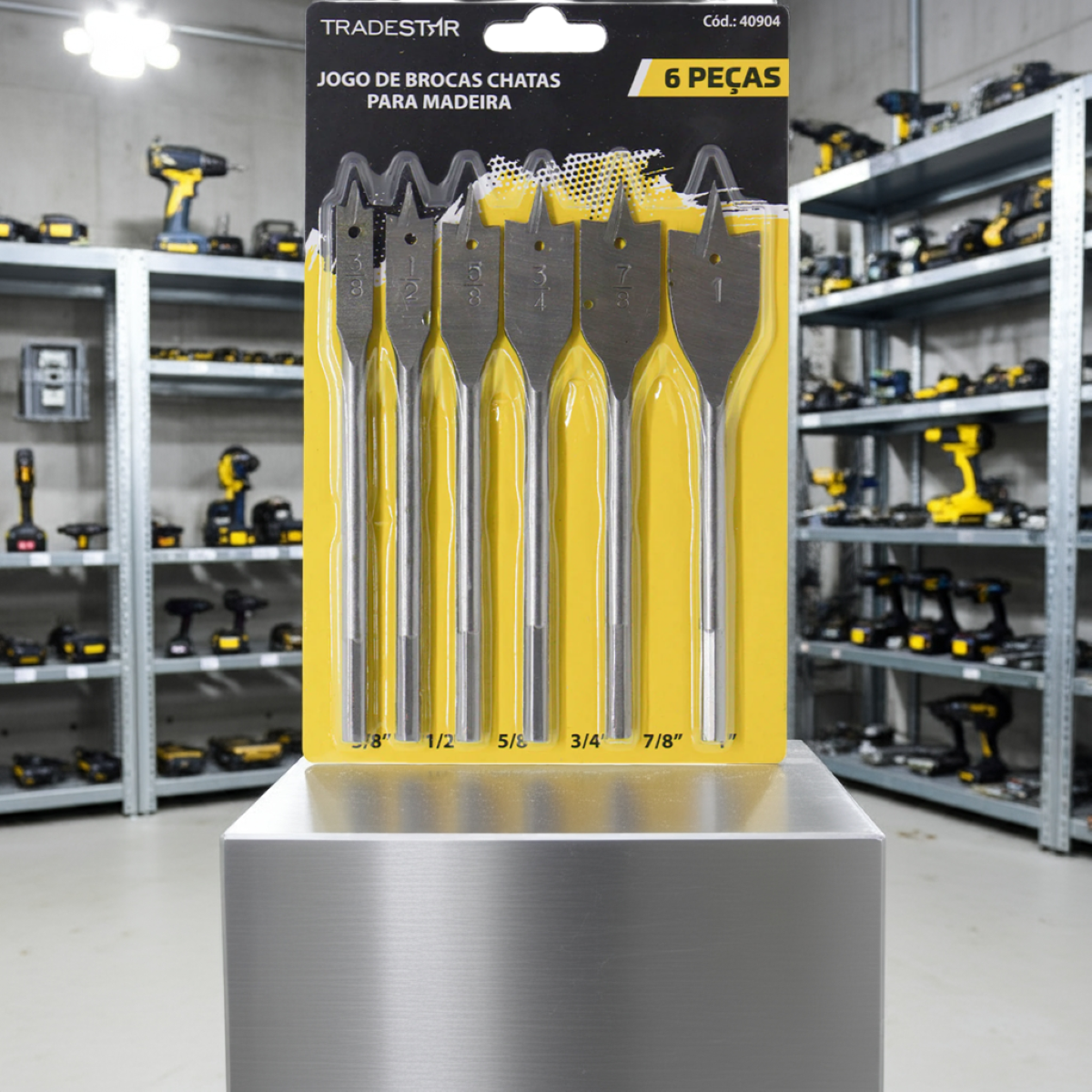 Jogo Broca Chatas Tradestar Madeira 3/8" - 1" 6 PeçasO Jogo de Brocas Chatas Tradestar é indispensável para quem precisa realizar furos largos e precisos em madeira maciça, compensados, MDF e laminados. Com design plano e ponta afiada, essas brocas proporcionam cortes limpos e perfuração eficiente, removendo o material de forma rápida e sem danificar a peça de trabalho.Fabricadas em aço carbono de alta resistência, garantem durabilidade e robustez, sendo ideais tanto para uso profissional em carpintaria e marcenaria quanto para projetos de instalação e reparos domésticos. Seu encaixe hexagonal oferece mais firmeza e segurança durante o uso, reduzindo riscos de deslizamento em furadeiras e parafusadeiras.O kit conta com 6 tamanhos diferentes (3/8" a 1"), cobrindo as principais necessidades de perfuração em madeira. Todas as peças possuem 15 cm de comprimento, permitindo trabalhos mais profundos em estruturas e peças de maior espessura.Especificações- Material: Aço carbono resistente-Tipo: Broca chata para madeira-Comprimento: 6" (15 cm)-Encaixe: Haste hexagonal para maior estabilidade-Aplicação: Perfuração em madeira maciça, MDF, compensado e laminadosItens inclusos- Broca 3/8" (9,5 mm)- Broca 1/2" (12,7 mm)- Broca 5/8" (15,8 mm)- Broca 3/4" (19 mm)- Broca 7/8" (22,2 mm)- Broca 1" (25,4 mm)Garantia- 03 meses com o Fabricante
