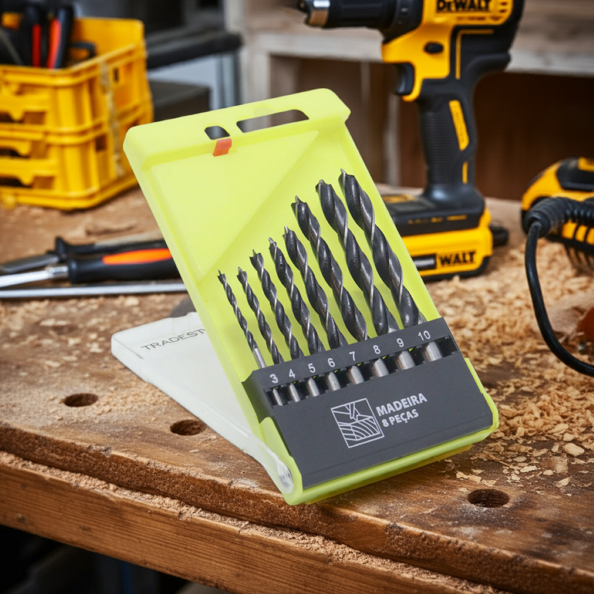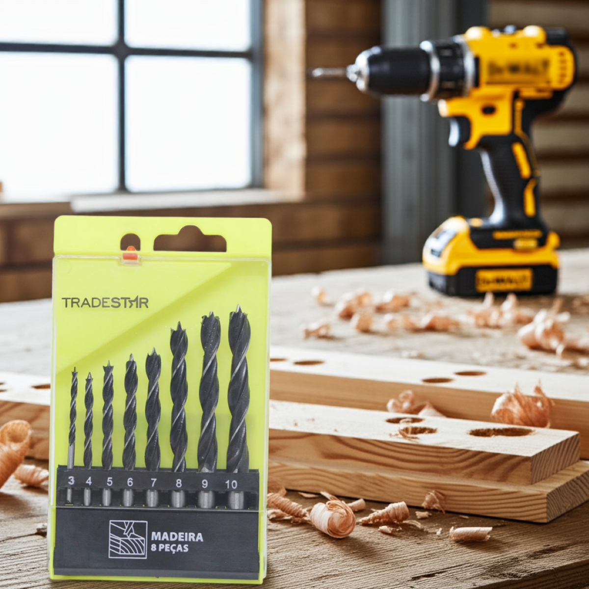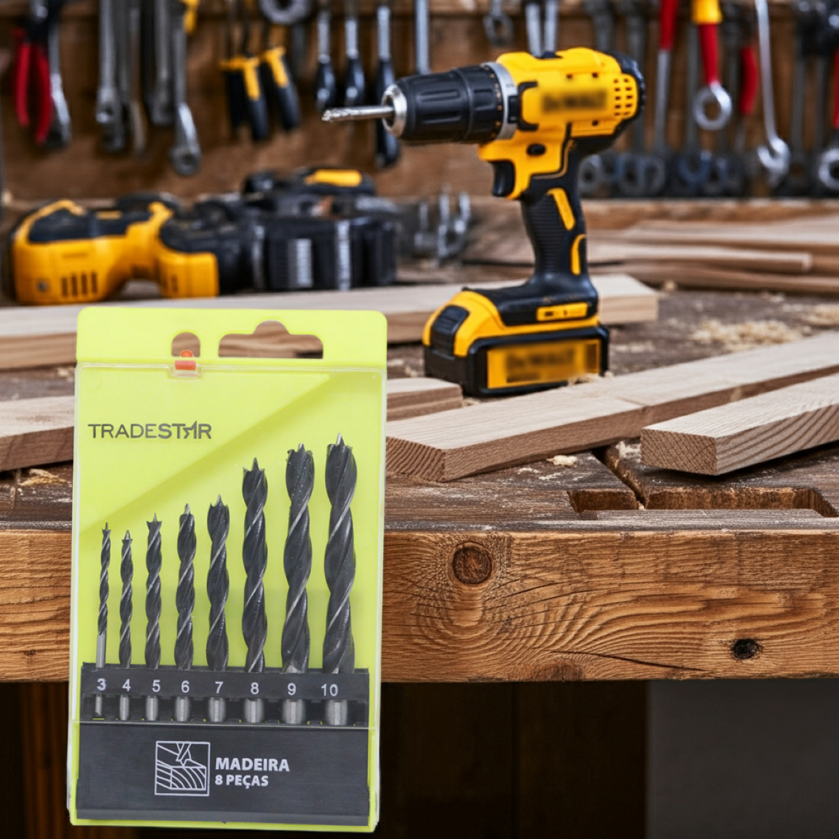 Jogo de Broca Aço 3 Pontas Tradestar Compensado Madeira 3 mm até 10 mm 8 PeçasO Jogo de Brocas Tradestar com 3 Pontas para Madeira é a escolha ideal para quem precisa de furos limpos, precisos e sem lascas em madeira maciça, MDF, compensados, aglomerados e até plásticos. O design com 3 pontas afiadas garante maior estabilidade durante a perfuração, evitando o escorregamento da broca e proporcionando cortes mais rápidos e uniformes.Produzidas em aço carbono de alta resistência, as brocas oferecem durabilidade superior e mantêm o fio de corte mesmo em trabalhos frequentes. Compatíveis com furadeiras manuais e elétricas, elas atendem tanto profissionais como marceneiros e carpinteiros, quanto quem realiza pequenos reparos e projetos de marcenaria em casa.O kit é composto por 8 brocas de diferentes tamanhos (3 mm a 10 mm), todas acondicionadas em um estojo organizador prático e resistente, que mantém as peças protegidas e sempre à mão. Com ele, você tem a ferramenta certa para montagens, instalações, fixação de acessórios e projetos de carpintaria em geral.Especificações- Material: Aço carbono resistente- Design: Ponta tripla para maior precisão e corte limpo- Aplicação: Madeira maciça, compensado, MDF, aglomerado e plásticos- Uso em: Furadeiras manuais e elétricas (não indicado para furadeiras de impacto)Itens inclusos- Broca 3 mm x 6 cm- Broca 4 mm x 7,5 cm- Broca 5 mm x 8,5 cm- Broca 6 mm x 9 cm- Broca 7 mm x 10,5 cm- Broca 8 mm x 10,5 cm- Broca 9 mm x 11,5 cm- Broca 10 mm x 12 cmGarantia- 03 meses com o Fabricante