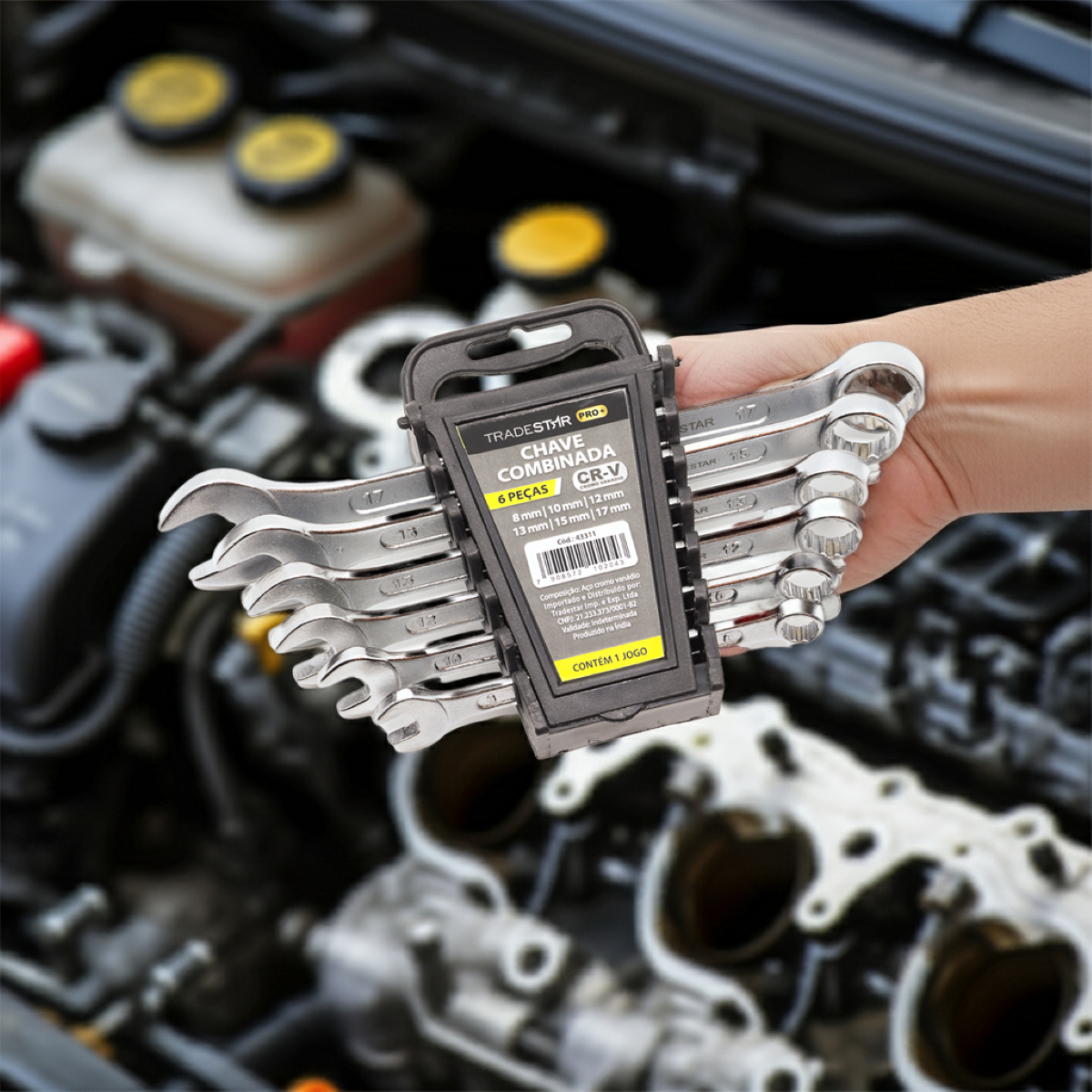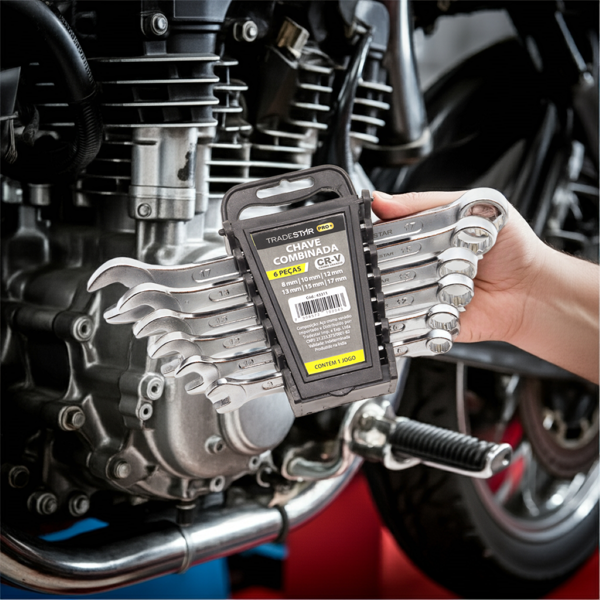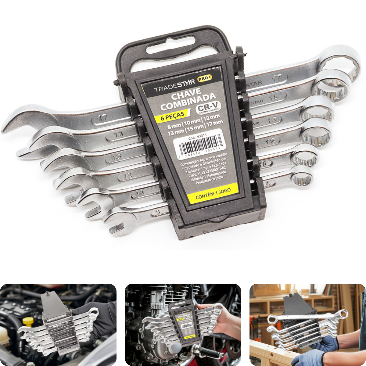 Jogo Chave Combinada Tradestar 8 mm até 17 mm 6 Peças Cromo VanádioO Jogo de Chaves Combinadas Tradestar 6 Peças é a escolha ideal para quem precisa de ferramentas resistentes, práticas e versáteis no dia a dia. Desenvolvido em Cromo Vanádio de alta qualidade, este kit garante excelente desempenho e durabilidade em serviços de manutenção, montagem e reparos em geral.Composto por 6 tamanhos essenciais – 8 mm, 10 mm, 12 mm, 13 mm, 15 mm e 17 mm – o conjunto oferece ampla cobertura das medidas mais utilizadas em trabalhos automotivos, mecânicos e domésticos. Assim, você sempre terá a ferramenta certa para apertar ou soltar porcas e parafusos sextavados com eficiência e segurança.O material em Cromo Vanádio reforçado assegura resistência ao uso contínuo, enquanto o acabamento especial protege contra corrosão e aumenta a vida útil das ferramentas. Além disso, o design ergonômico das chaves oferece conforto no manuseio, mesmo durante longas horas de trabalho.Compacto e funcional, o Jogo de Chaves Combinadas Tradestar é indispensável para mecânicos, montadores, eletricistas, hobbistas e qualquer pessoa que valorize ferramentas de qualidade profissionalEspecificações- Acabamento: Proteção contra oxidação- Medidas: 8 mm / 10 mm / 12 mm / 13 mm / 15 mm / 17 mm- Quantidade de peças: 6 unidades- Uso: Aperto e soltura de porcas e parafusos sextavadosItens inclusos- 1 Jogo Chave Combinada 8-17 mm 6 Peças Cromo VanádioGarantia- 03 meses com o Fabricante