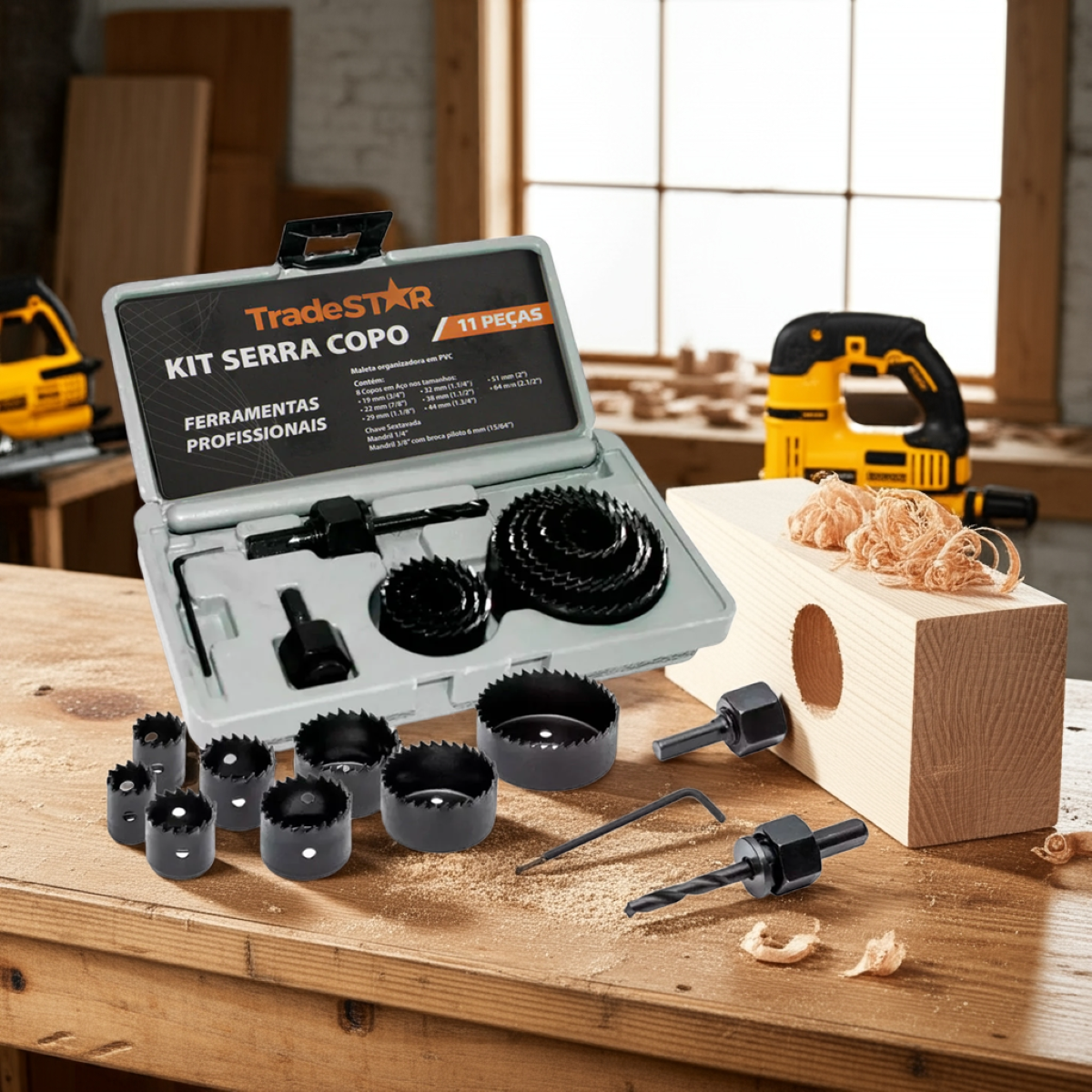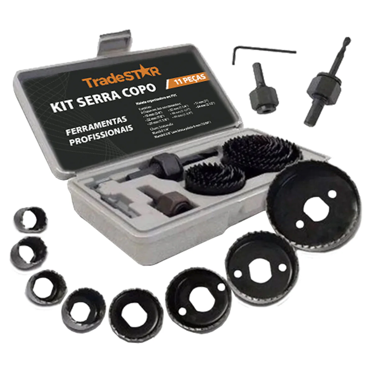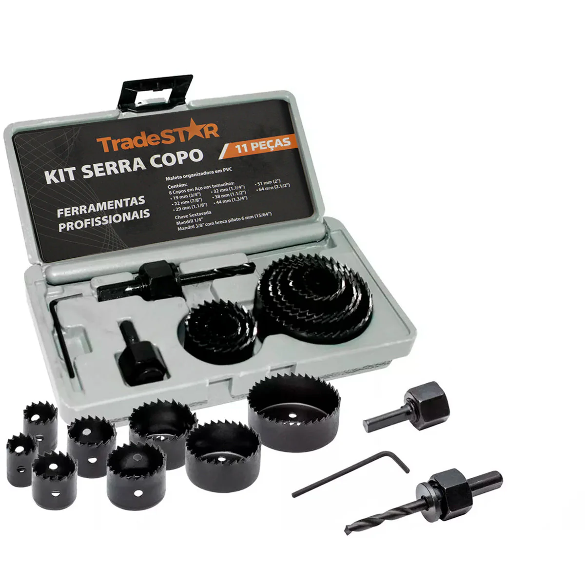 Jogo Serra Copo Tradestar 11 peças 19 até 64 mm Aço CarbonoO Jogo de Serra Copo Tradestar 11 Peças é a solução ideal para quem busca praticidade, precisão e eficiência na execução de cortes circulares. Fabricadas em aço carbono de alta durabilidade, as serras oferecem resistência e longa vida útil, sendo perfeitas para aplicações em madeira, MDF e compensado.Composto por 8 tamanhos diferentes de serras copo, o kit atende às mais variadas necessidades em obras, marcenaria, reformas e projetos DIY. Além disso, acompanha 2 hastes de acoplamento com broca piloto, garantindo cortes firmes e seguros, e uma chave Allen para montagem rápida e prática.Para maior organização e transporte, o conjunto vem acondicionado em uma maleta plástica resistente, que mantém todas as peças bem protegidas e sempre à mão. Uma ferramenta indispensável tanto para profissionais quanto para hobbistas que exigem qualidade e versatilidade no dia a dia.Especificações- Material: Aço carbono- Quantidade: 11 peças- Diâmetros das serras copo: 19 mm (3/4"), 22 mm (7/8"), 29 mm (1.1/8"), 32 mm (1.1/4"), 38 mm (1.1/2"), 44 mm (1.3/4"), 51 mm (2") e 64 mm (2.1/2")- Hastes de acoplamento: Mandril 6 mm (1/4") e Mandril 9,5 mm (3/8"), ambos com broca piloto de 6 mm (15/64")- Acompanha chave Allen sextavada- Maleta plástica para organização e transporte- Indicação: cortes circulares em madeira, MDF e compensadoItens inclusos- 1 Jogo Serra Copo 19-64 mm 11 Peças AcGarantia- 03 meses com o Fabricante