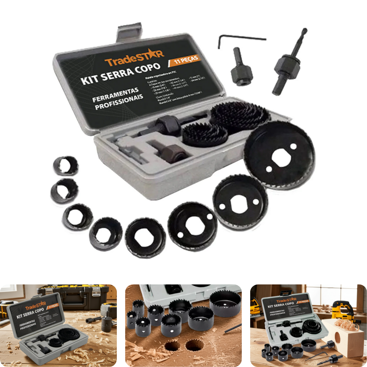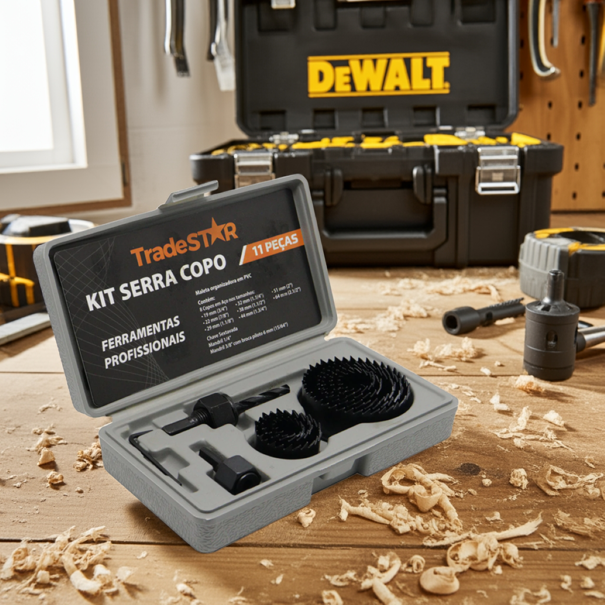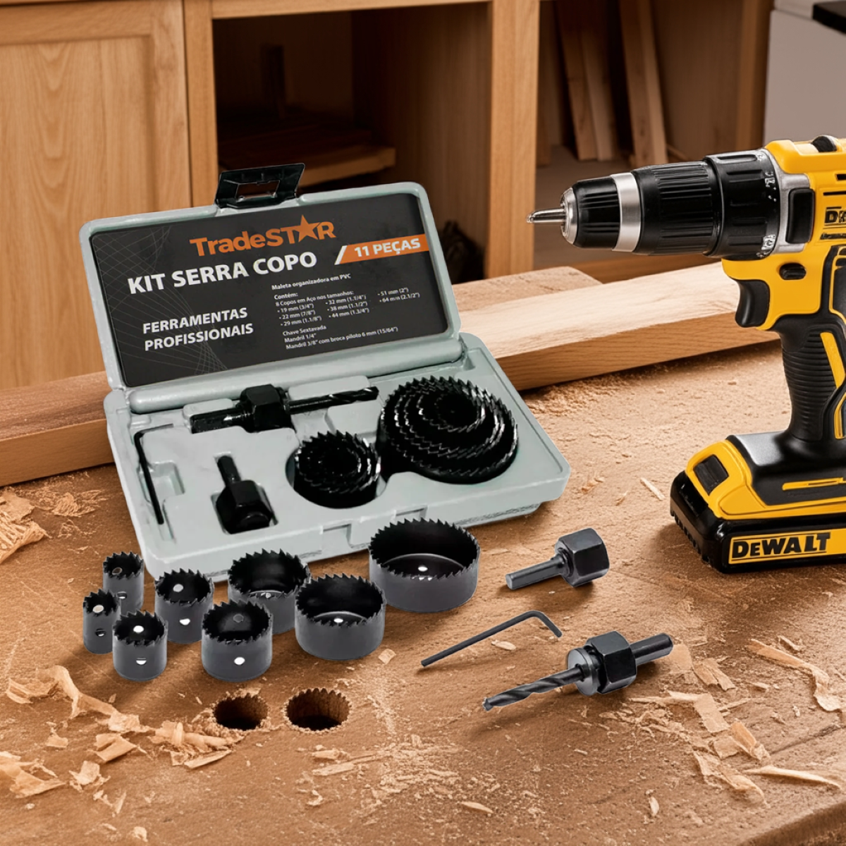 Jogo Serra Copo Tradestar 11 peças 19 até 64 mm Aço CarbonoO Jogo de Serra Copo Tradestar 11 Peças é a solução ideal para quem busca praticidade, precisão e eficiência na execução de cortes circulares. Fabricadas em aço carbono de alta durabilidade, as serras oferecem resistência e longa vida útil, sendo perfeitas para aplicações em madeira, MDF e compensado.Composto por 8 tamanhos diferentes de serras copo, o kit atende às mais variadas necessidades em obras, marcenaria, reformas e projetos DIY. Além disso, acompanha 2 hastes de acoplamento com broca piloto, garantindo cortes firmes e seguros, e uma chave Allen para montagem rápida e prática.Para maior organização e transporte, o conjunto vem acondicionado em uma maleta plástica resistente, que mantém todas as peças bem protegidas e sempre à mão. Uma ferramenta indispensável tanto para profissionais quanto para hobbistas que exigem qualidade e versatilidade no dia a dia.Especificações- Material: Aço carbono- Quantidade: 11 peças- Diâmetros das serras copo: 19 mm (3/4"), 22 mm (7/8"), 29 mm (1.1/8"), 32 mm (1.1/4"), 38 mm (1.1/2"), 44 mm (1.3/4"), 51 mm (2") e 64 mm (2.1/2")- Hastes de acoplamento: Mandril 6 mm (1/4") e Mandril 9,5 mm (3/8"), ambos com broca piloto de 6 mm (15/64")- Acompanha chave Allen sextavada- Maleta plástica para organização e transporte- Indicação: cortes circulares em madeira, MDF e compensadoItens inclusos- 1 Jogo Serra Copo 19-64 mm 11 Peças AcGarantia- 03 meses com o Fabricante