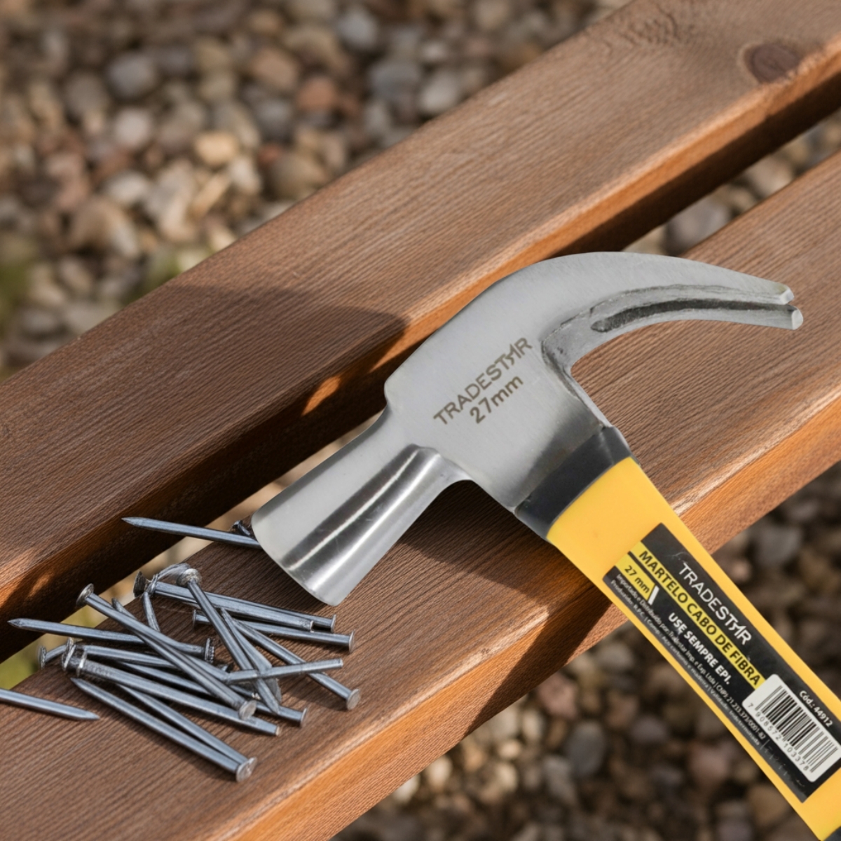 Martelo Unha Tradestar 27 mm Cabo FibraO Martelo Unha Tradestar 27 mm é a escolha ideal para profissionais e entusiastas de marcenaria, carpintaria e pequenos reparos domésticos, oferecendo precisão, resistência e segurança em cada golpe. Fabricado em aço de alta qualidade e equipado com cabo de fibra ergonômico, garante maior conforto, reduzindo o impacto nas mãos durante trabalhos prolongados.Perfeito para fixação e remoção de pregos, montagem de móveis, estruturas de madeira e projetos DIY, este martelo alia durabilidade e design inteligente, proporcionando eficiência em oficinas, estúdios de marcenaria ou atividades de manutenção. Seu formato clássico e sólido é pensado para trabalhos contínuos, combinando força e ergonomia para que cada tarefa seja realizada com segurança e rapidez.Além disso, o Martelo Unha Tradestar é ferramenta versátil, podendo ser utilizado tanto em ambientes profissionais quanto em casa, garantindo alto desempenho em aplicações diversas e sendo um aliado indispensável para quem busca resultados confiáveis e acabamento de qualidade.Especificações- Tipo: Martelo unha- Material da cabeça: Aço de alta resistência- Diâmetro da cabeça: 27 mm- Cabo: Fibra ergonômica- Uso indicado: Marcenaria, carpintaria, reparos manuaisItens inclusos- 1 Martelo Unha 27 mm Cabo FibraGarantia- 03 meses com o Fabricante