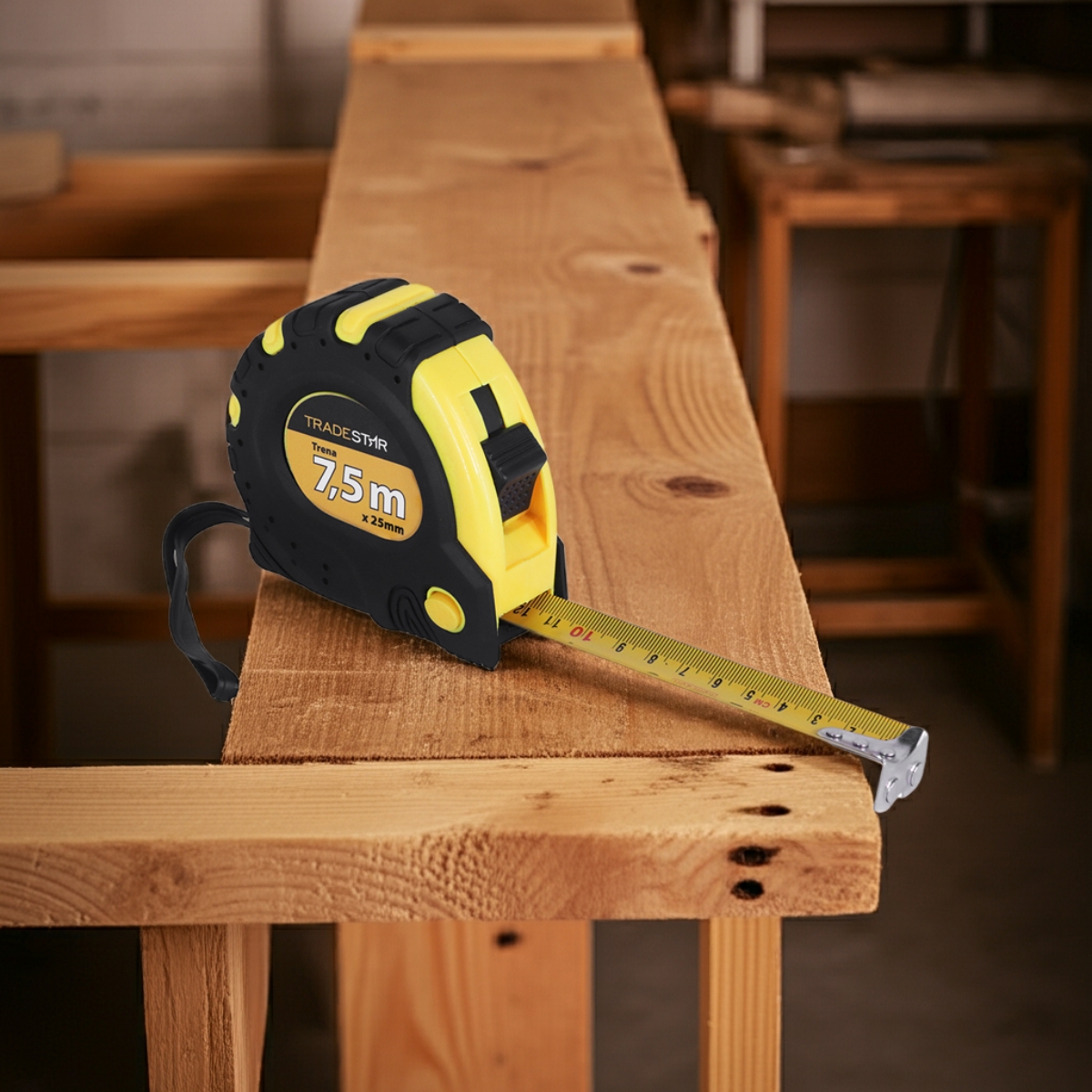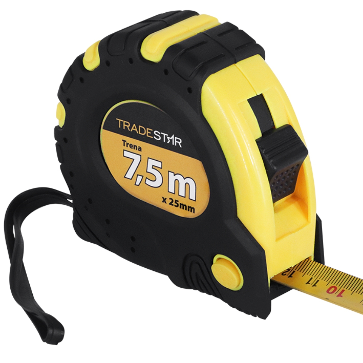 Trena Métrica Tradestar 7,5 m X 25 mm Emborrachada 3 TravasA Trena Métrica Tradestar é uma ferramenta essencial para profissionais de construção civil, carpintaria, marcenaria e áreas que exigem medições precisas. Seu corpo emborrachado oferece conforto e segurança durante o uso, além de maior resistência a quedas e impactos.Equipada com 3 travas independentes, a trena permite que a fita seja bloqueada em diferentes posições, facilitando medições longas e evitando recuos indesejados. A presilha para cinto garante transporte prático, mantendo a ferramenta sempre à mão durante trabalhos em campo ou na oficina. Durável, confiável e de fácil manuseio, esta trena é indicada para profissionais que buscam precisão, agilidade e praticidade em cada medição.Especificações- Dimensões: 7,5 m x 25 mm- Número de travas: 3- Corpo emborrachado para maior aderência e resistência- Presilha para cinto para transporte prático- Uso indicado: Construção civil, carpintaria, marcenaria e medições geraisItens inclusos- 1 Trena 7,5 M X 25 mm Emborrachada 3 TravasGarantia- 03 meses com o Fabricante