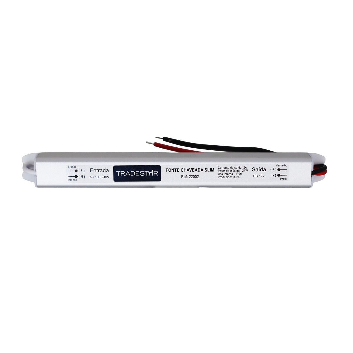 Fonte LED Tradestar Slim 24W 2A 12VA Fonte LED Slim 24W 2A 12V Tradestar foi desenvolvida para oferecer alimentação estável e segura a equipamentos que utilizam baixa tensão contínua. Compacta e leve, é ideal para projetos que exigem praticidade sem abrir mão da eficiência.Com potência de 24W e corrente de 2A, é indicada principalmente para fitas de LED, módulos de LED, luminárias de baixo consumo, câmeras de segurança e pequenos dispositivos eletrônicos. Sua carcaça slim permite instalação em espaços reduzidos, facilitando a integração em móveis planejados, sancas de gesso e projetos decorativos.Equipada com proteção contra sobrecarga, sobretensão e curto-circuito, garante maior durabilidade e segurança tanto para a fonte quanto para os equipamentos conectados.Especificações- Modelo: Fonte LED Slim Tradestar- Potência: 24W- Corrente: 2A- Tensão de saída: 12V DC- Tensão de entrada: 110V/220V (bivolt automático ou chaveado)- Proteções: Sobrecarga, sobretensão e curto-circuito- Estrutura: Slim (compacta e leve)- Aplicações: Fitas e módulos de LED, luminárias de baixa potência, pequenos eletrônicos e sistemas de automaçãoItens inclusos- 1 Fonte Led Slim 24W 2A 12V TradestarGarantia- 03 meses com o Fabricante