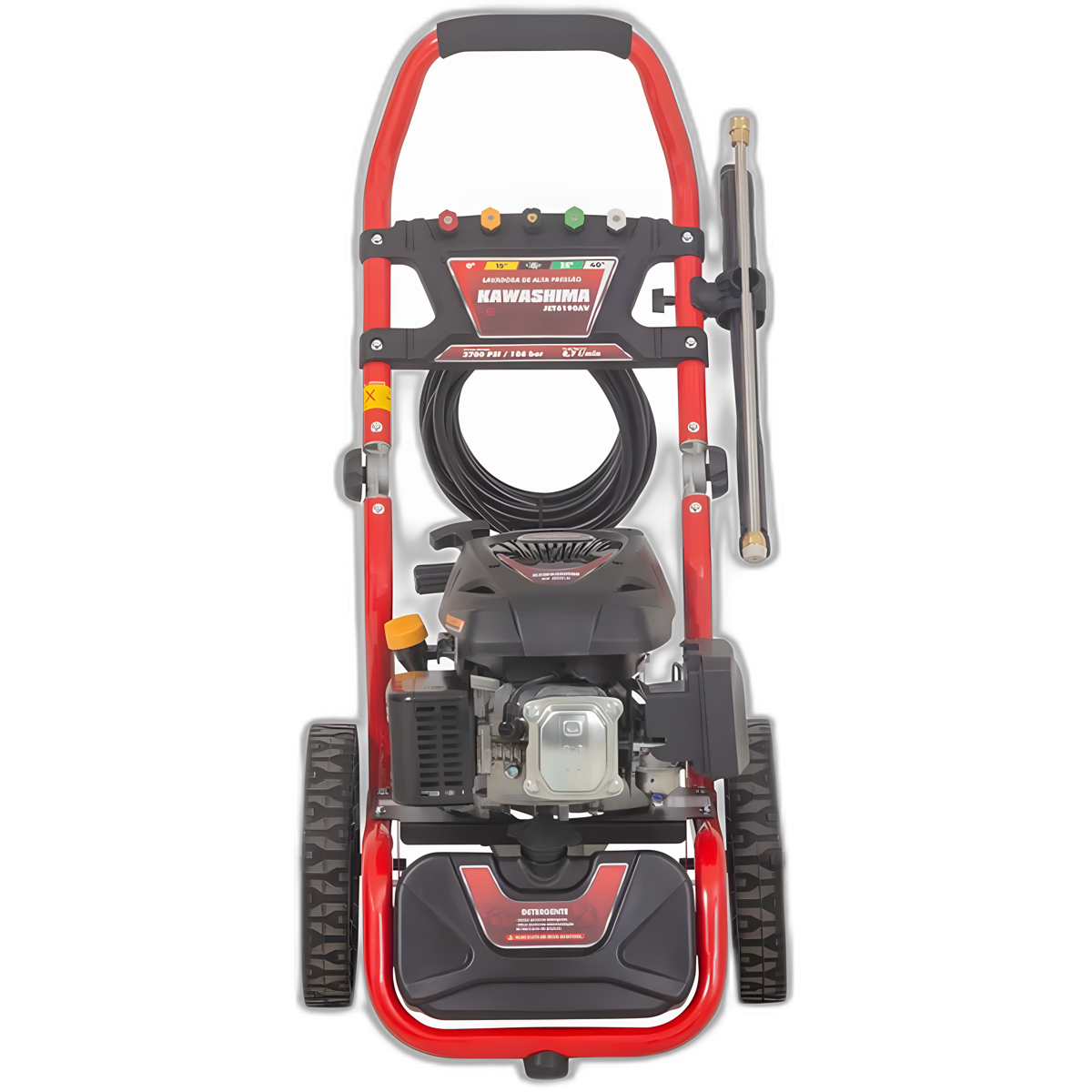 Lavadora Alta Pressão Kawashima 6HP Gasolina: Potência Profissional para Limpeza PesadaPrepare-se para uma revolução na limpeza de grandes áreas com a Lavadora Alta Pressão Kawashima JET 6190-AV a Gasolina. Projetada para encarar os desafios mais exigentes, esta máquina robusta é equipada com um motor a gasolina Kawashima GV 600-H de 6,0 HP, garantindo potência e autonomia para qualquer tipo de trabalho pesado, onde quer que você precise. Sua bomba axial de alta performance entrega uma pressão máxima impressionante de 2700 PSI (186 bar) e uma vazão máxima de 8,7 litros por minuto, removendo sujeira incrustada, lodo e detritos com facilidade incomparável.Ideal para uma vasta gama de aplicações, desde a limpeza profunda de pátios, decks e calçadas até a higienização de chiqueiros, veículos agrícolas como tratores e colheitadeiras, caminhões e equipamentos pesados. A Lavadora Kawashima oferece versatilidade com seus 5 bicos de engate rápido (0°, 15°, 25°, 40° e um especial para detergente), permitindo ajustar o jato para cada tipo de superfície. Com uma mangueira de 8 metros e válvula Easy Start, a operação é prática e segura, transformando tarefas árduas em um processo eficiente e rápido. Invista em durabilidade e performance superior para resultados impecáveis.Especificações Tipo: Lavadora de alta pressão a gasolina Motor: Kawashima GV 600-H, Monocilíndrico, vertical, 4 tempos, refrigerado a ar, OHV, gasolina Potência máxima: 6 HP Cilindradas: 173 cc Sistema de partida: Manual, retrátil Bomba: Axial Pressão máxima: 18,6 MPa (186 bar / 2700 PSI) Pressão de trabalho: 15,5 MPa (155 bar / 2250 PSI) Vazão máxima: 8,7 l/min Vazão nominal: 7,8 l/min Capacidade do tanque de combustível: 1,0 L Capacidade do cárter (óleo motor): 600 ml Óleo lubrificante do motor: SAE 20W40 Capacidade do reservatório de detergente: 3,6 L Capacidade do reservatório de óleo da bomba: 500 ml Óleo lubrificante da bomba: SAE 10W30 Temperatura máxima da água: 40° C Rodas: 12 Dimensões: 660 x 500 x 1045 mm Peso líquido: 23 kg Peso bruto: 26 kg Válvula Easy Start: Sim Válvula de segurança (Térmica): Sim Válvula de segurança (Pressão): Sim Cabeçote: AlumínioItens Inclusos 1 mangueira (8 m) com trama de nylon 1 pistola com trava de segurança 1 mangueira para detergentes 5 bicos com engate rápido (0°, 15°, 25°, 40° e especial para detergente)Perguntas Frequentes (FAQ) Pergunta: Qual a pressão máxima de trabalho da lavadora?Resposta: A pressão máxima de trabalho é de 18,6 MPa (2700 PSI), enquanto a pressão de trabalho é de 15,5 MPa (2250 PSI). Pergunta: Para quais tipos de limpeza esta lavadora é recomendada?Resposta: É ideal para limpeza de pátios, decks, chiqueiros, veículos, tratores, colheitadeiras, caminhões e trabalhos pesados em geral. Pergunta: A lavadora vem com bicos?Resposta: Sim, acompanha 5 bicos com engate rápido: 0°, 15°, 25°, 40° e um bico especial para aplicação de detergente. Pergunta: Qual o comprimento da mangueira que acompanha o produto?Resposta: A lavadora é acompanhada por uma mangueira de 8 metros com trama de nylon, proporcionando bom alcance. Pergunta: É possível usar detergente com esta lavadora?Resposta: Sim, ela possui um reservatório de detergente de 3,6 L e um bico especial para sua aplicação.
