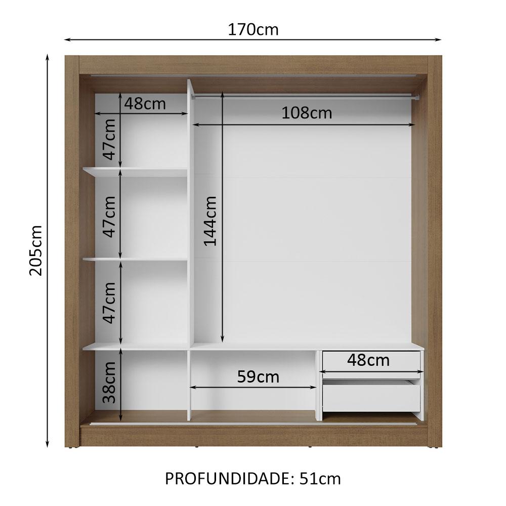 Com o Guarda-Roupa Casal Sublime da Madesa os seus itens vão ficar mais organizados e ao alcance no dia a dia.Características principais: Conta com portas de correr que deslizam suavemente, graças aos trilhos superiores e inferiores em alumínio. Isso garante um funcionamento tranquilo e sem esforço. Duas portas contam com espelhos, que são úteis no dia a dia e deixam o móvel ainda mais elegante.Ótimo espaço interno e organização: Ideal para um casal, possui diversos nichos e duas gavetas que facilitam a organização de roupas, calçados e acessórios. O tubo cabideiro metálico é resistente e perfeito para pendurar roupas longas.Acabamento de qualidade: Combinando os tons amadeirado Rustic e cinza, o acabamento é realizado com a Pintura Poliéster de sete camadas da Madesa, um método ecológico que oferece maior durabilidade e proteção.Medidas totais: 205 cm de altura x 170 cm de largura x 51 cm de profundidade.O que você recebe:- Um (1) Guarda-roupa com duas gavetas e três portas de correr, sendo duas com espelhos- Ferragens e manual de montagemCódigo do produto: 1193F92E2GÉ bom saber:- As imagens são meramente ilustrativas- A Madesa não disponibiliza serviço de montagem1 – O produto vem montado? Se não, vocês realizam a montagem?R.: A Madesa não disponibiliza serviço de montagem. Todos os produtos seguem com manual de instalação e as ferragens necessárias. Alguns produtos possuem vídeo explicando o passo a passo da montagem.2 – Vocês possuem loja física? Posso retirar meu produto em mãos?R.: Não possuímos loja física, apenas loja virtual. Confira as opções de envio ao colocar o seu CEP.3 – Qual é o valor do envio? Posso pagar separadamente?R.: O valor do envio é calculado com base no peso e volume do produto, e no CEP de destino. Você pode calcular o valor e prazo de entrega no simulador.4 – A Madesa entrega em todo Brasil? Como é feita a entrega?R.: Sim, entregamos no Brasil inteiro através de transportadoras parceiras.A Madesa possui compromisso com a sustentabilidade. Geramos energia limpa em nossa própria usina, priorizamos fornecedores responsáveis e utilizamos plástico reciclado em nossa produção. Além disso, reinserimos sobras no ciclo de reciclagem e investimos no desenvolvimento de nossos colaboradores e da comunidade.Garantia: Este produto conta com 1 ano de garantia total, sendo 3 meses de garantia legal e 9 meses de garantia contratual. A garantia cobre exclusivamente defeitos de fabricação e vícios ocultos. Não estão cobertos: problemas decorrentes de montagem incorreta, uso inadequado, exposição à umidade, calor ou luz solar direta, modificações no produto ou desgaste natural.
