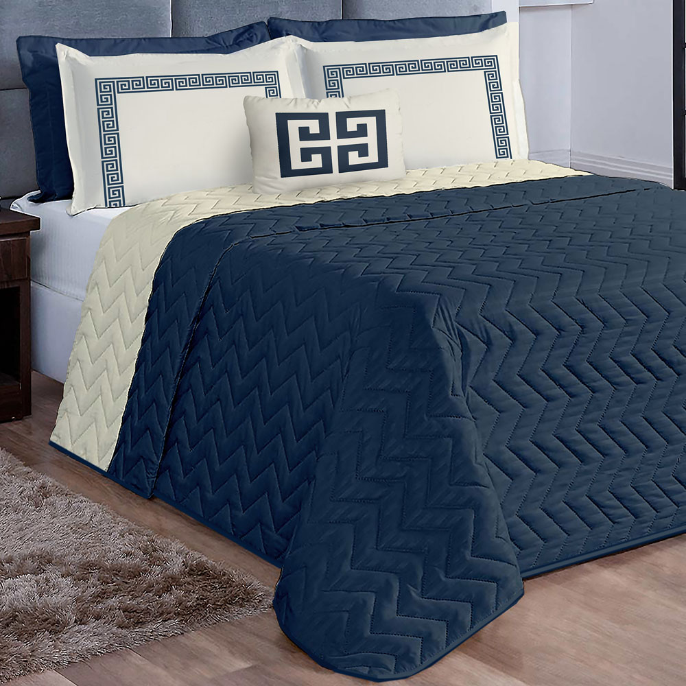 Kit Cobre Leito Colcha Mistral Casal Padrão Microfibra Dupla Face 7 Peças - Azul Marinho