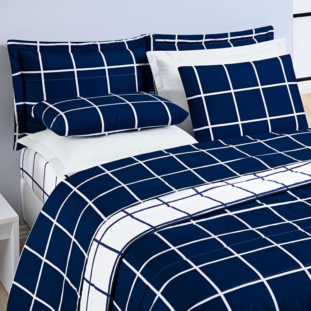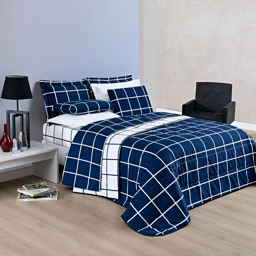Kit Cobre Leito Colcha Brooklyn Queen Quadriculado Micropercal 200 Fios 3 Peças - Azul Marinho