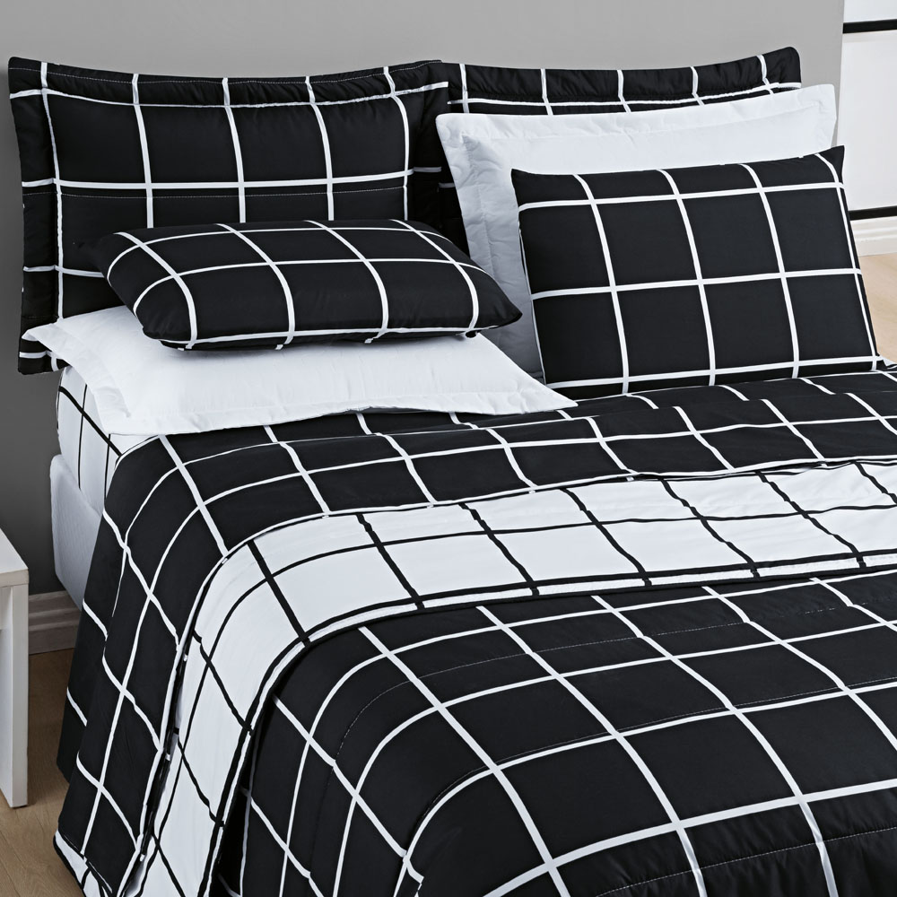 Kit Cobre Leito Colcha Brooklyn Queen Quadriculado Micropercal 200 Fios 3 Peças - Preto