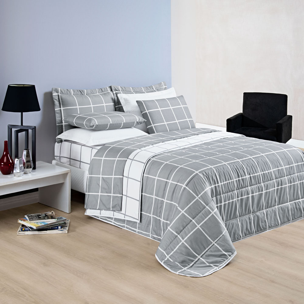 Kit Cobre Leito Colcha Brooklyn King Quadriculado Micropercal 200 Fios 3 Peças - Cinza