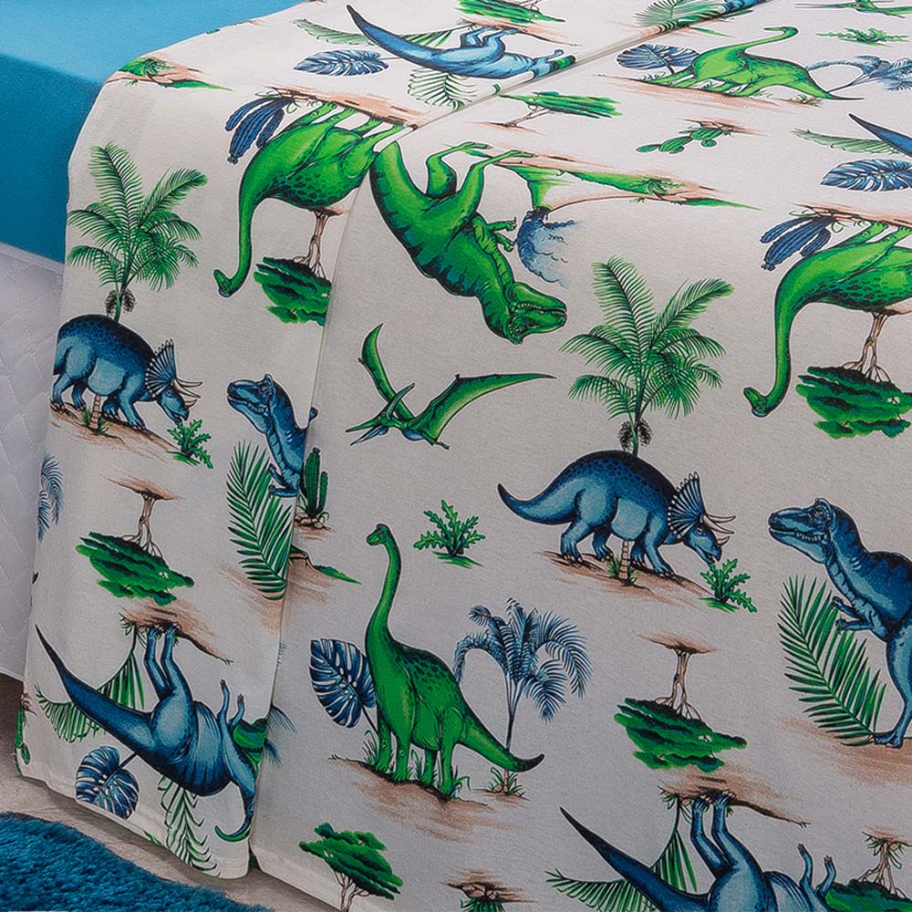 Jogo Cama Lençol Diverkids Solteiro Infantil Malha Soft Algodão 3 Peças - Dinossauro Verde Azul
