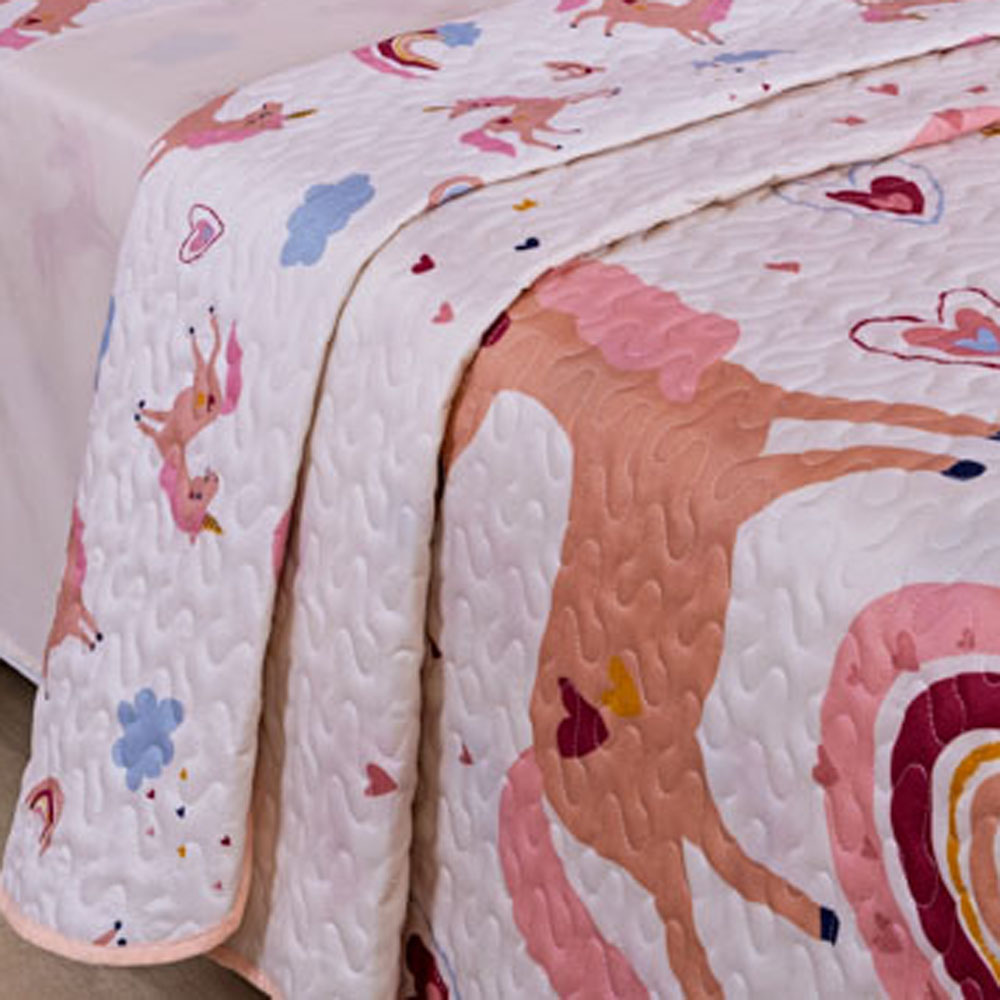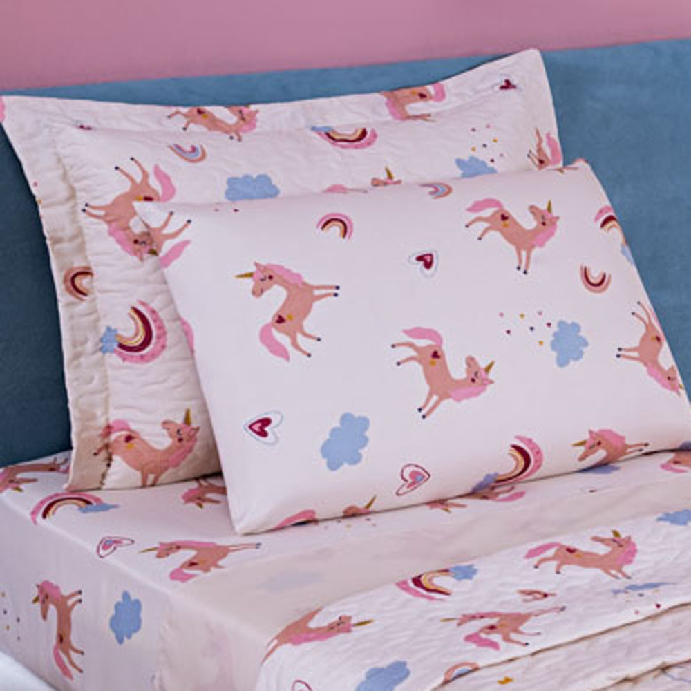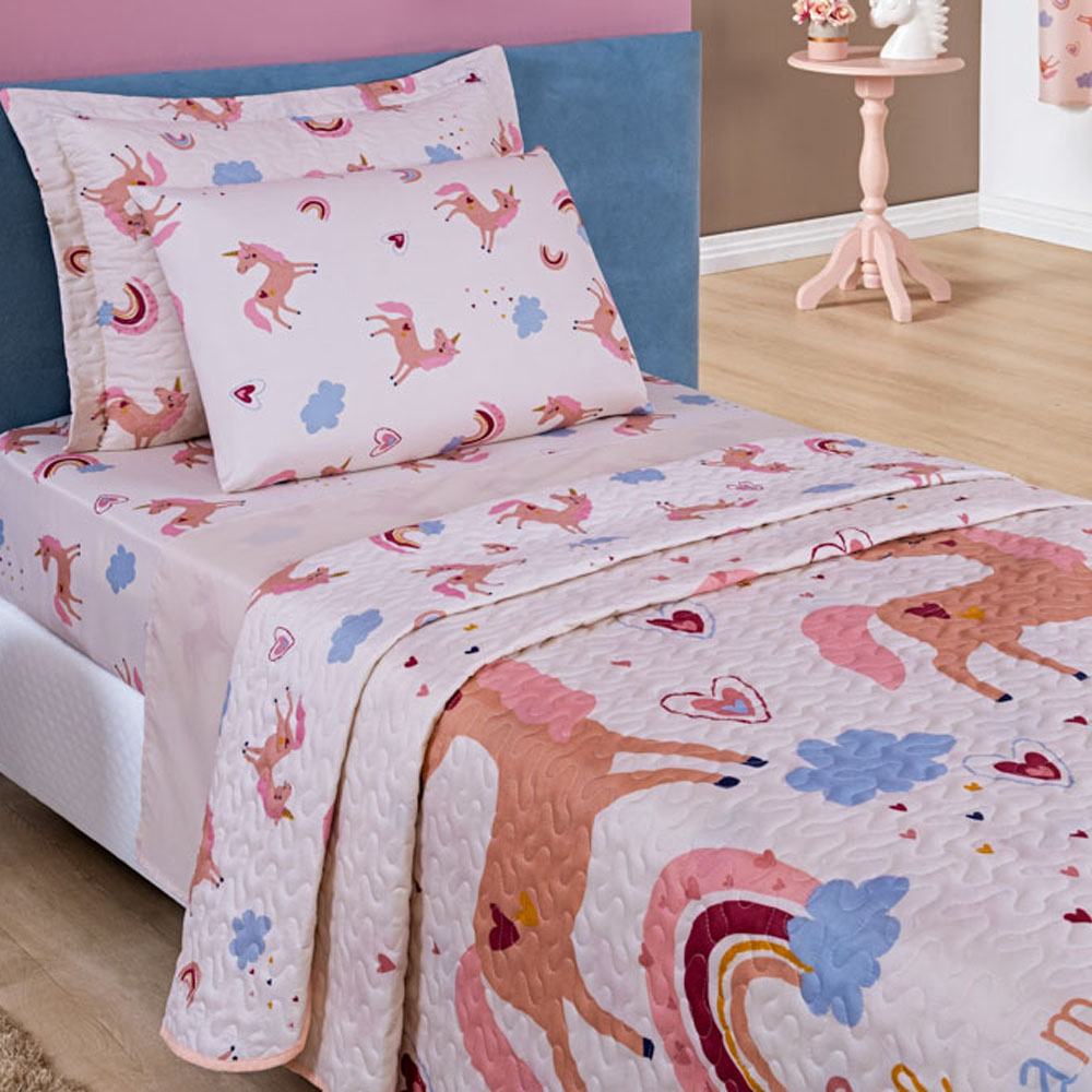 Kit 5 Peças Fantasy = Colcha Solteiro Infantil + Jogo de Lençol - Unicórnio Rosê