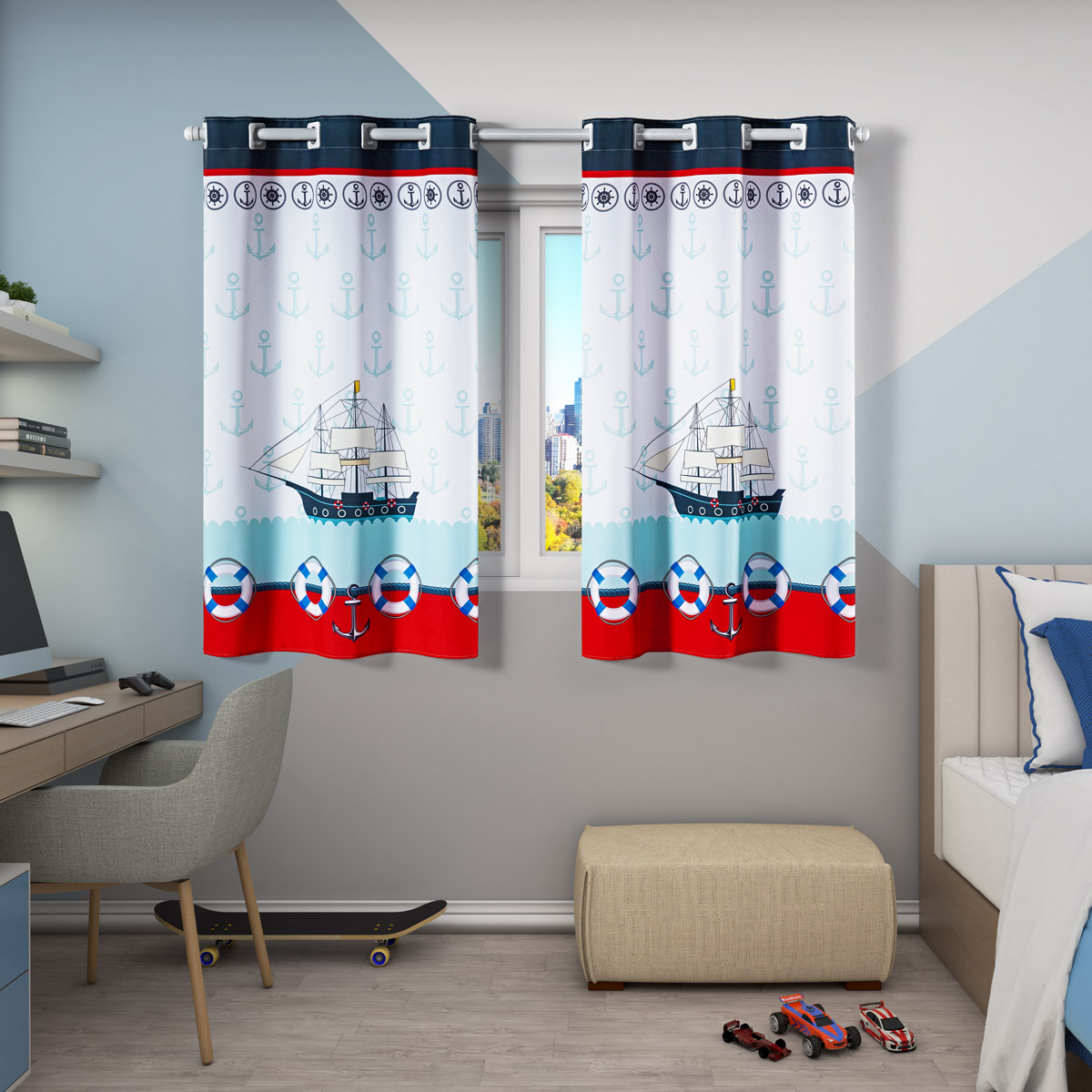Cortina Kids Infantil Varão Tecido Oxford 2,00m X 1,30m - Barco Pirata Marinheiro Azul