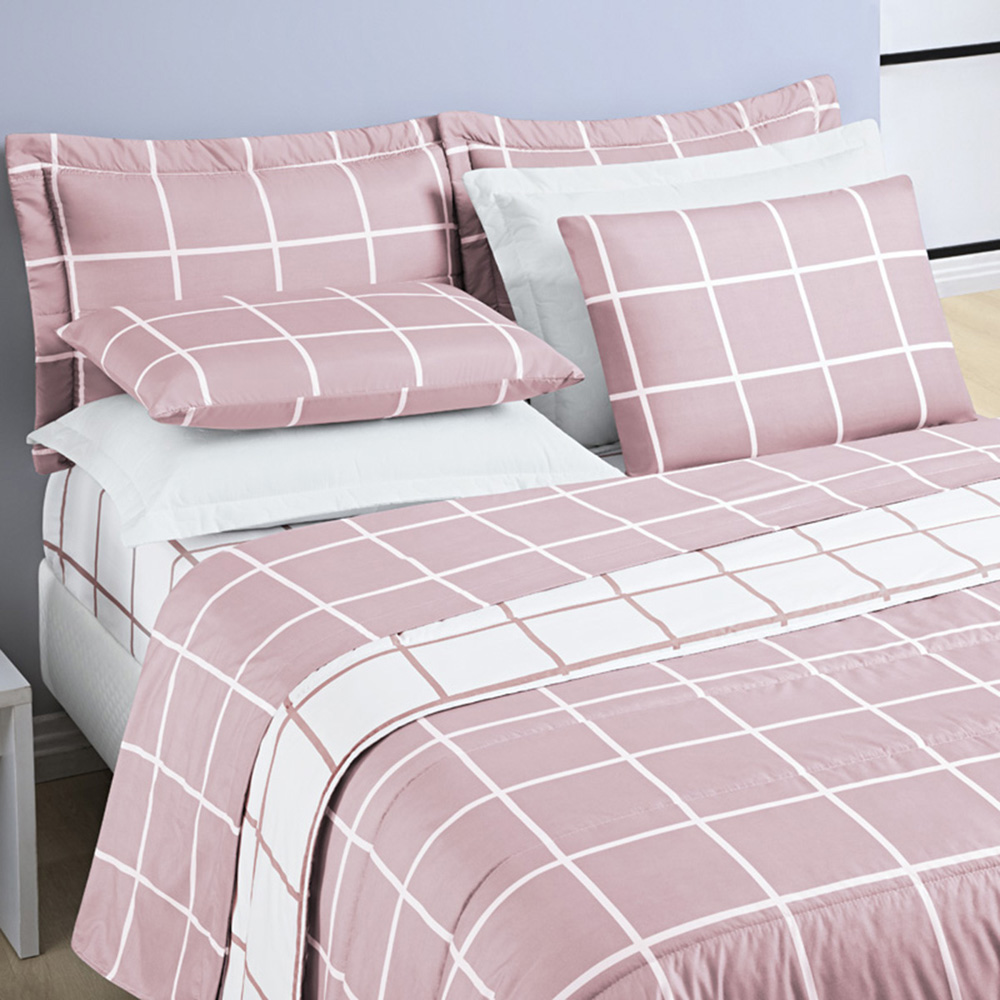 Kit Cobre Leito Colcha Brooklyn King Quadriculado Micropercal 200 Fios 3 Peças - Rosa