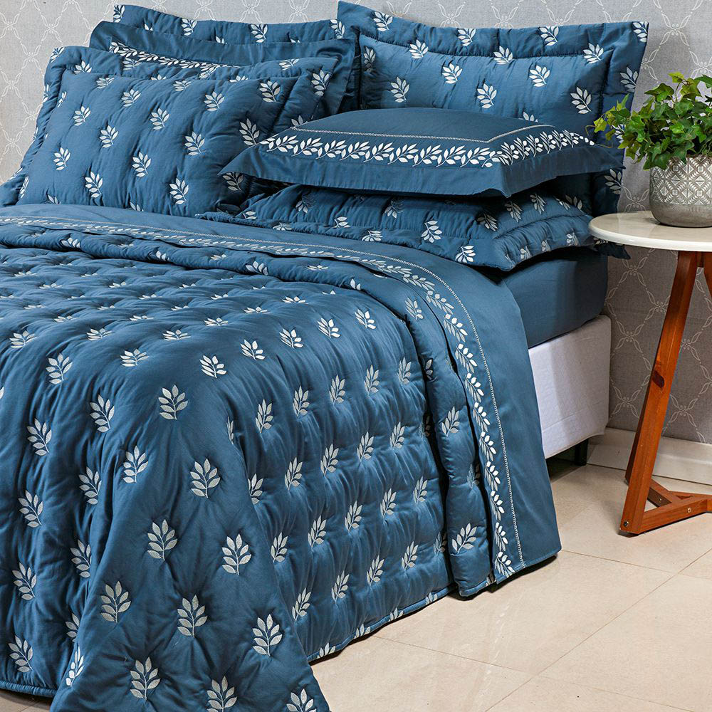 Kit Cobre Leito Colcha Garland Super King 100% Algodão 400 Fios Acetinado Bordado 5 Peças - Azul Marinho