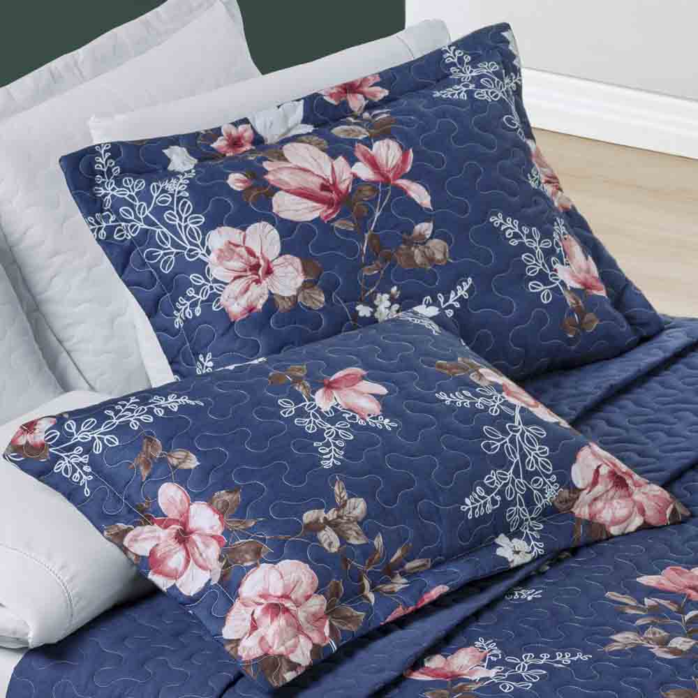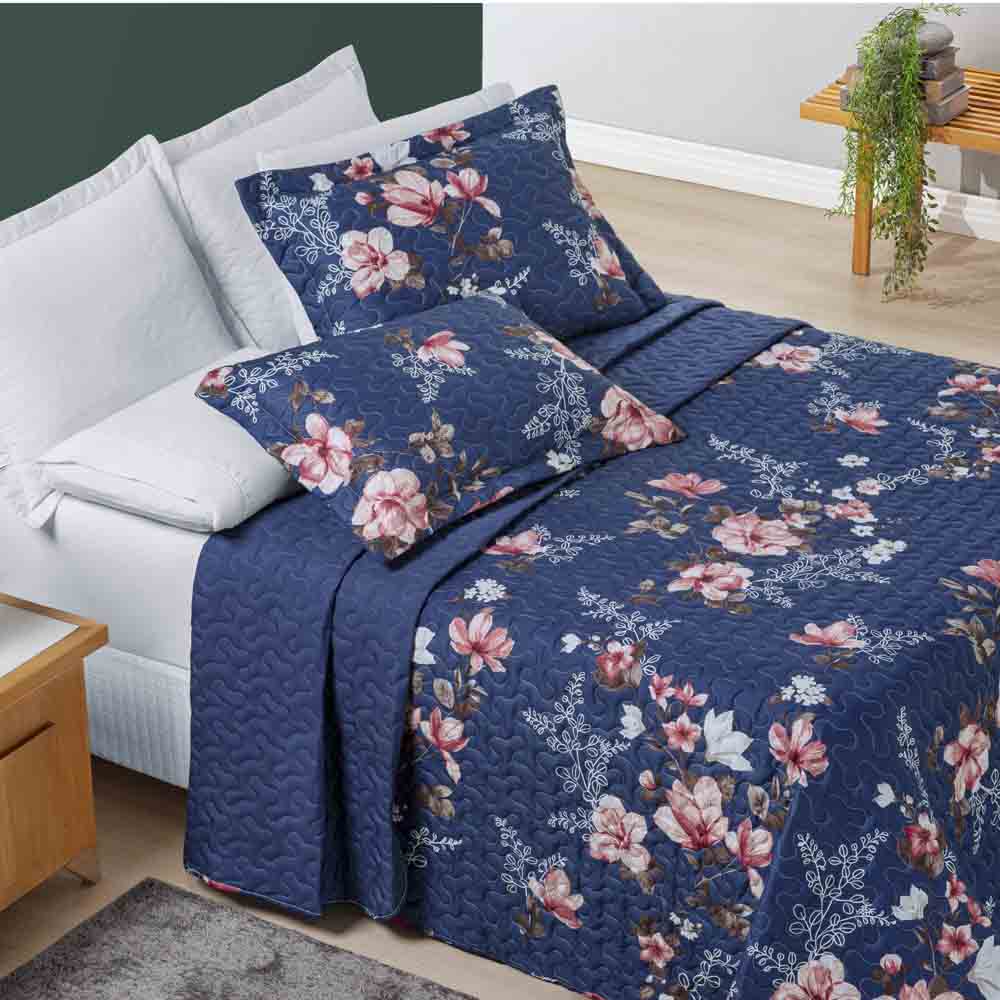 Kit Cobre Leito Colcha Celi King Dupla Face Micropercal 200 Fios 3 Peças - Azul Marinho Floral