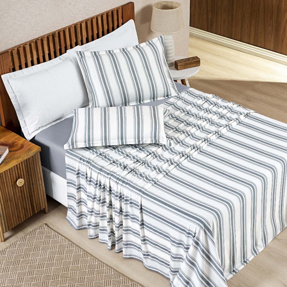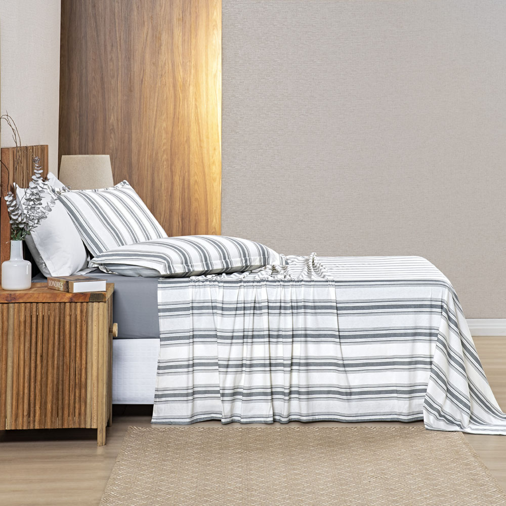 Jogo Cama Lençol Daily Solteiro Malha Algodão Listrado 3 Peças - Cinza