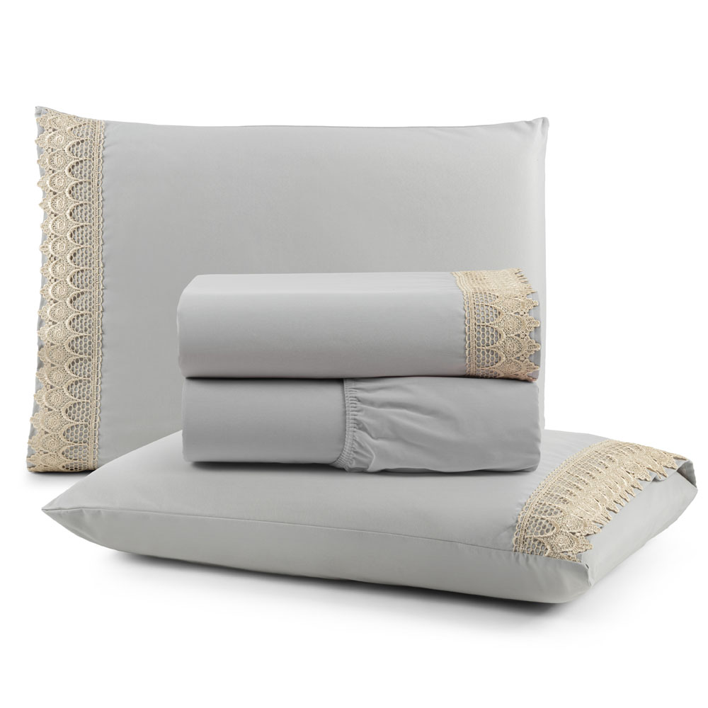 Jogo Cama Lençol Haia Queen Percal 200 Fios Algodão Guipir Bordado Inglês 4 Peças - Cinza