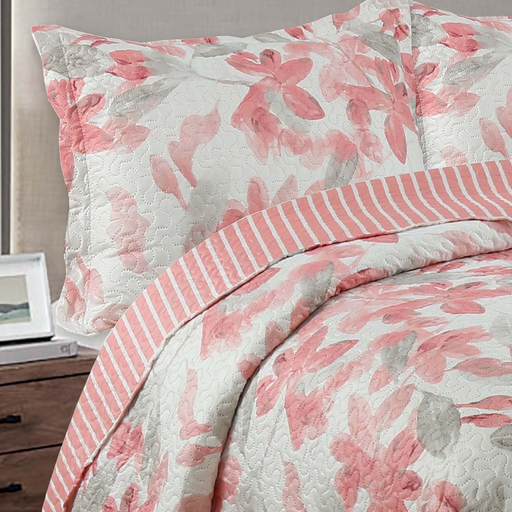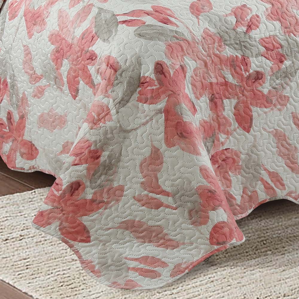 Kit Cobre Leito Colcha Mix Queen Estampado Dupla Face Floral 3 Peças - Cecília - Salmão