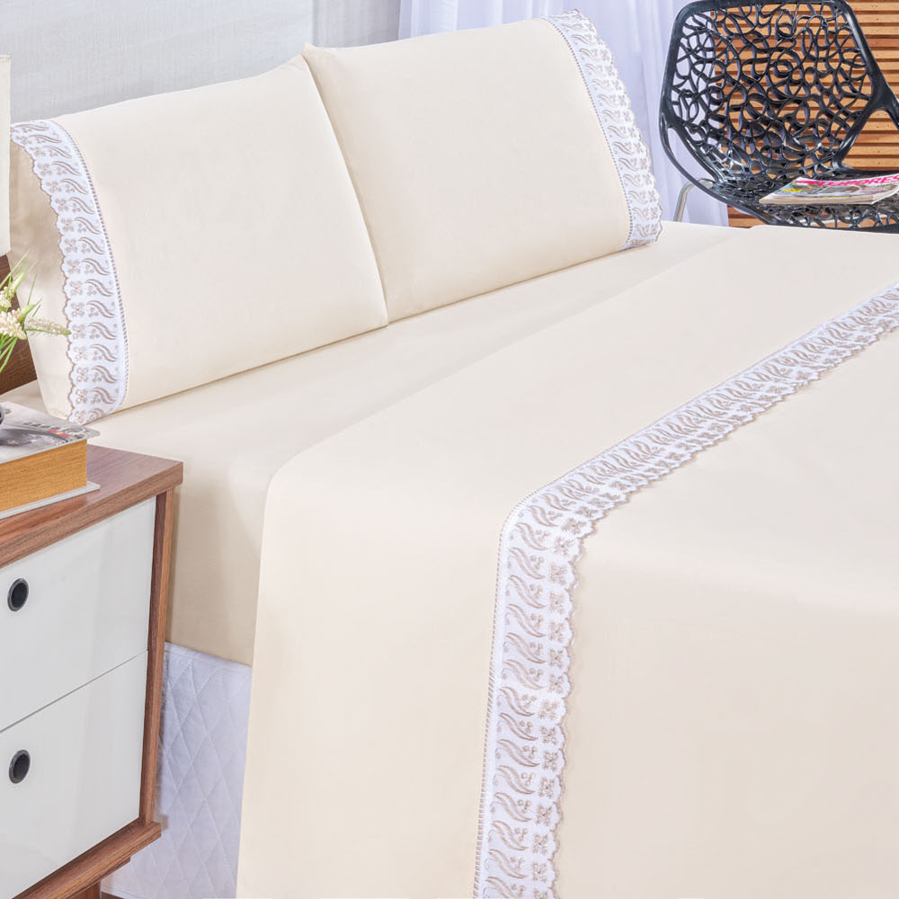 Jogo Cama Lençol Paris Queen Percal 180 Fios 100% Algodão Lese Bordada 4 Peças - Palha