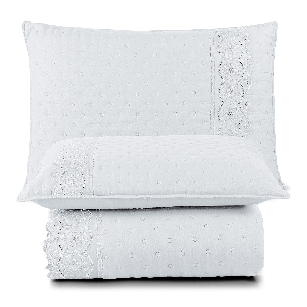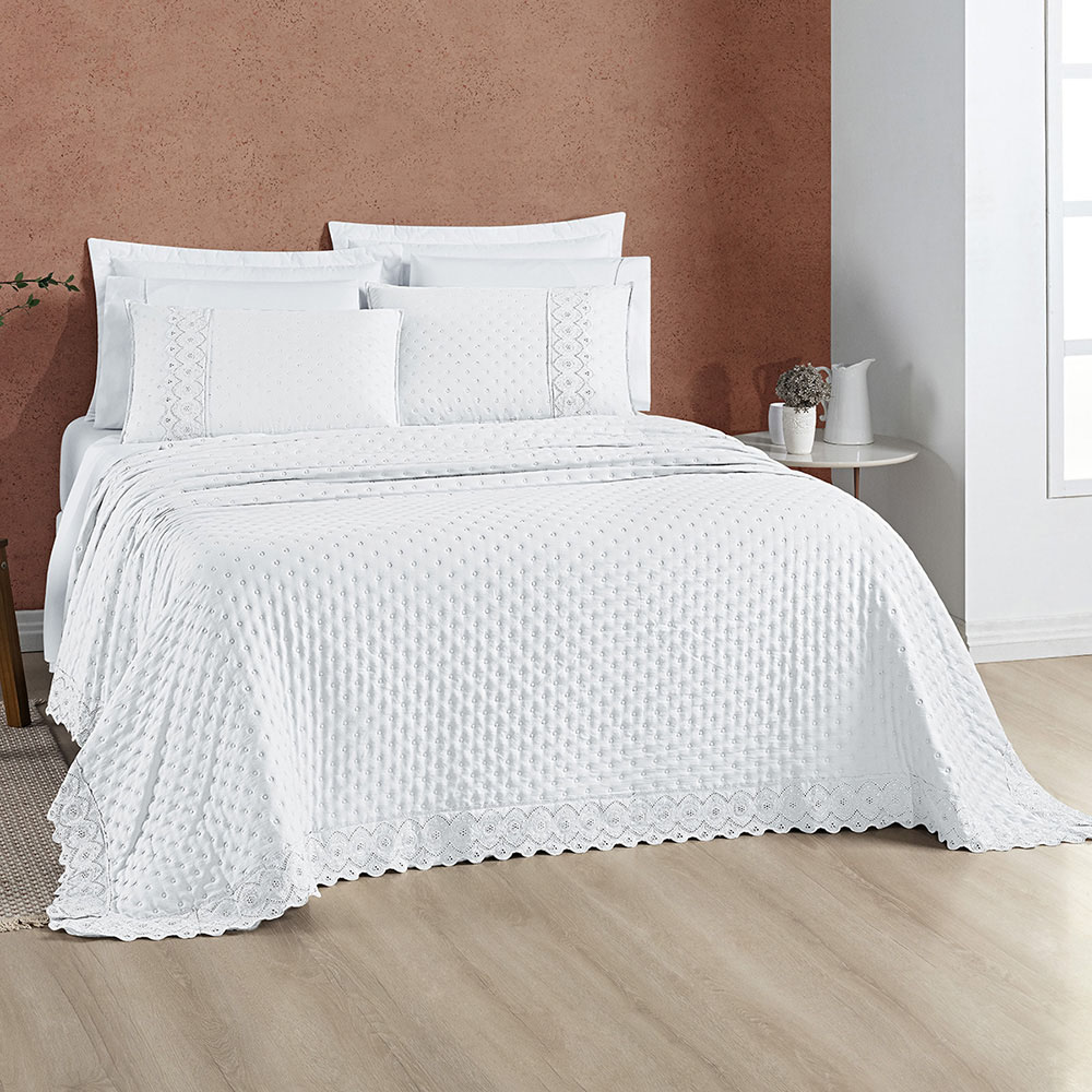 Kit Cobre Leito Colcha Bouclê Casal Padrão Laise Bordada Micropercal 200 Fios 3 Peças - Branco Neve
