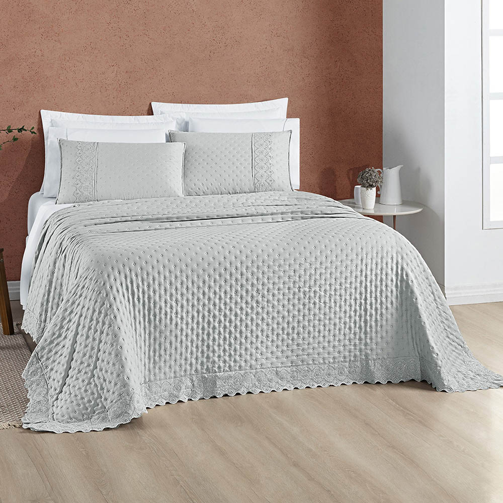 Kit Cobre Leito Colcha Bouclê Queen Laise Bordada Micropercal 200 Fios 3 Peças - Cinza Geada