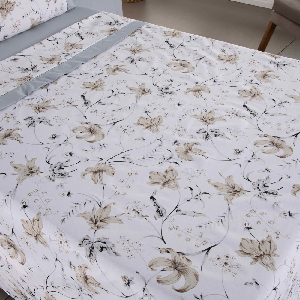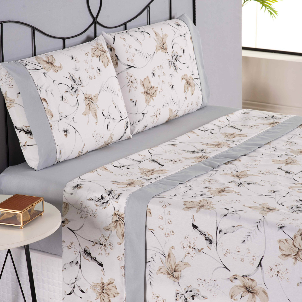 Jogo Cama Lençol Encanto King Estampado Percal 180 Fios c/ Ponto Palito 4 Peças - Floral - Cinza