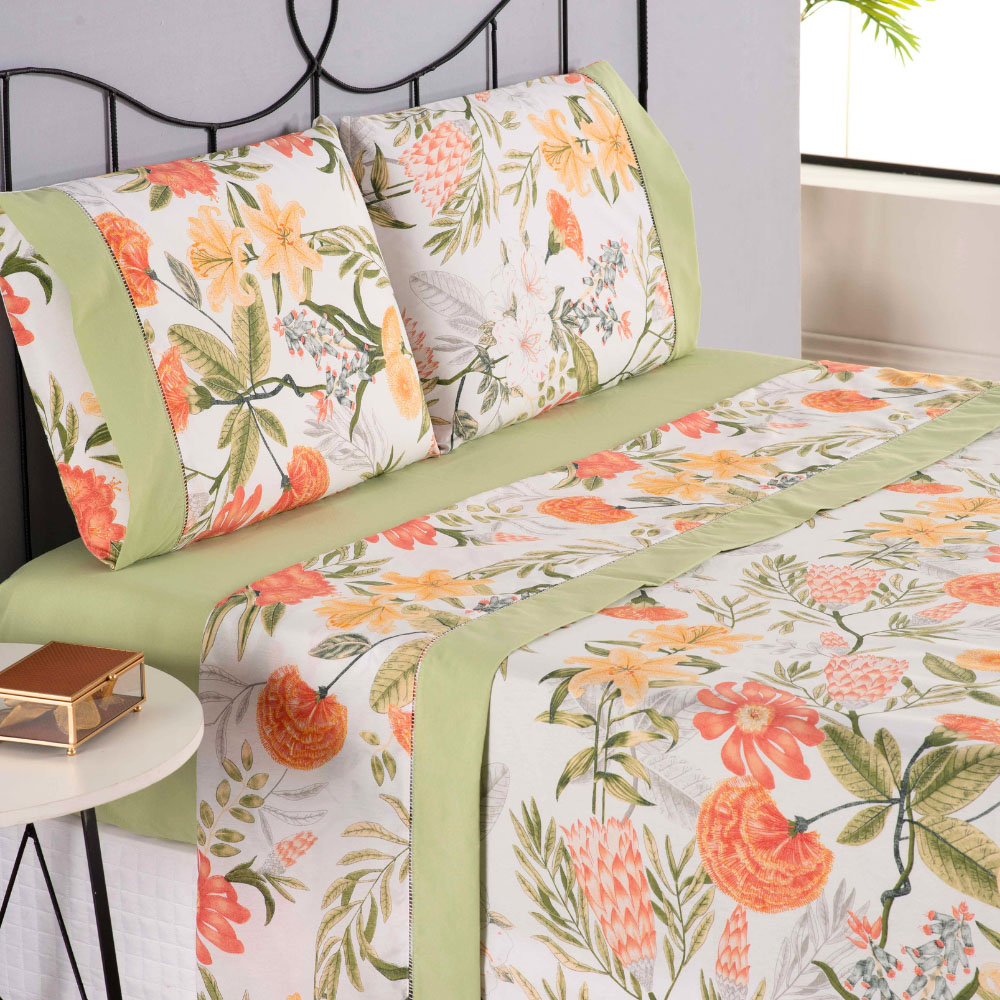 Jogo Cama Lençol Encanto King Estampado Percal 180 Fios c/ Ponto Palito 4 Peças - Floral - Verde