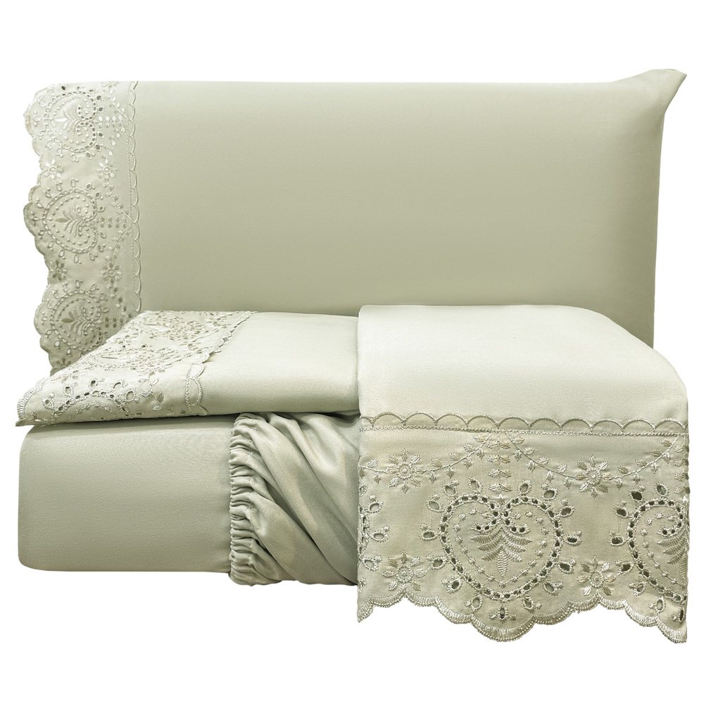 Jogo Cama Lençol Detail Casal Padrão Bordado Guipir Bordado Inglês Percal 300 Fios 4 Peças - Bege