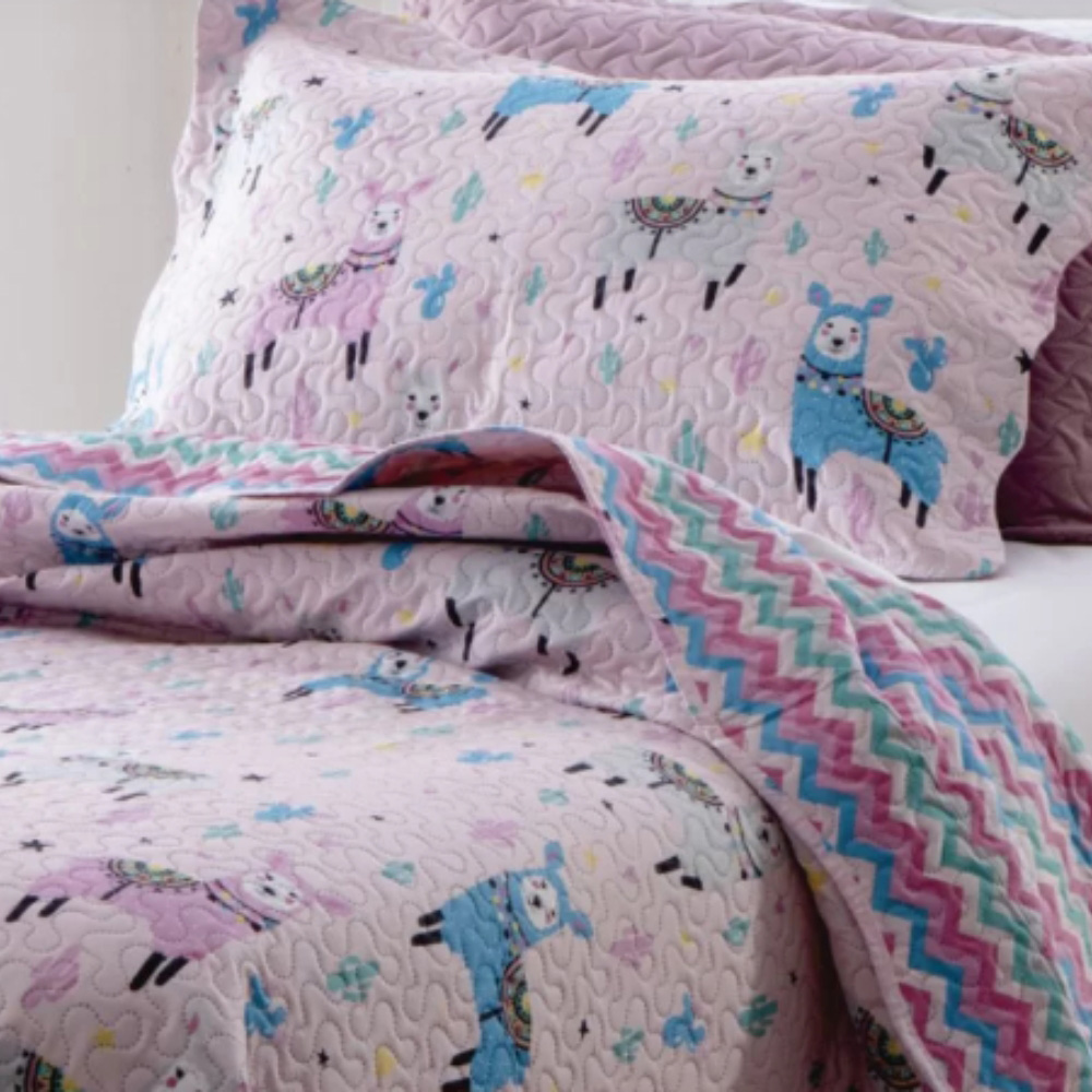 Kit Cobre Leito Colcha Solteiro Infantil Studio Dupla Face Estampado 2 Peças - Lhama - Rosa