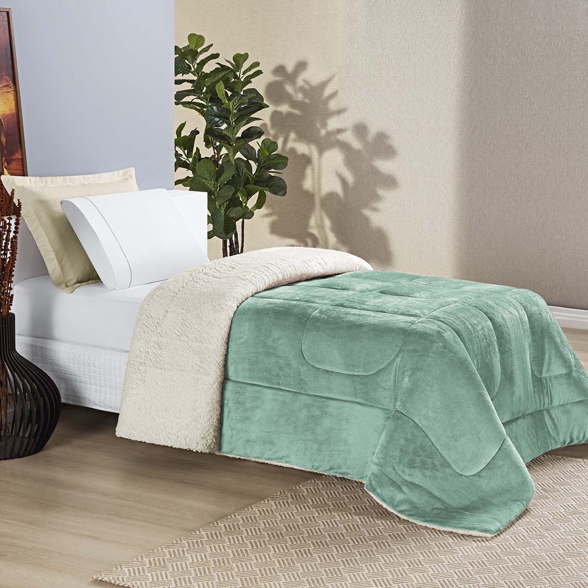 Coberdrom Apollo Solteiro Sherpa Manta Flannel Toque Lã de Carneiro - Verde Alecrim
