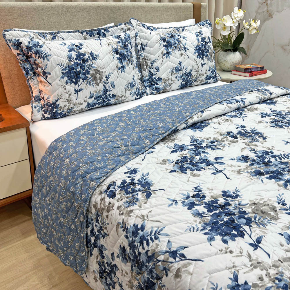 Kit Cobre Leito Colcha Classics King Dupla Face Percal 300 Fios Estampado 3 Peças - Flores Azuis