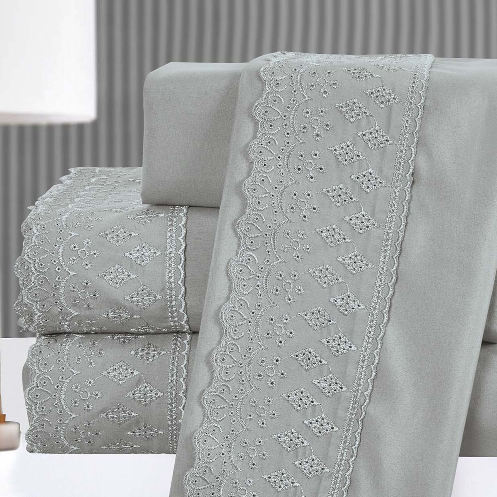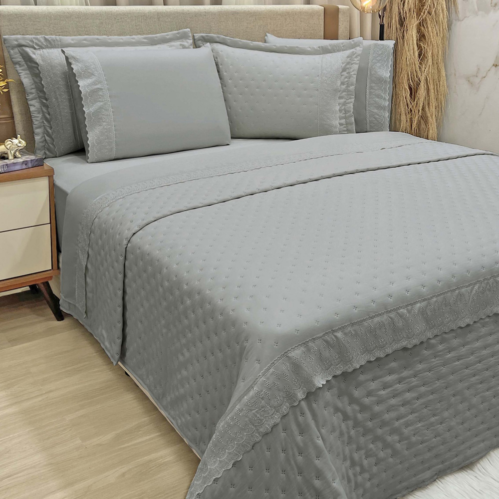Kit Coordenado Grécia Cobre Leito + Jogo de Cama Queen Bordado Inglês 300 Fios - 7 Peças - Cinza