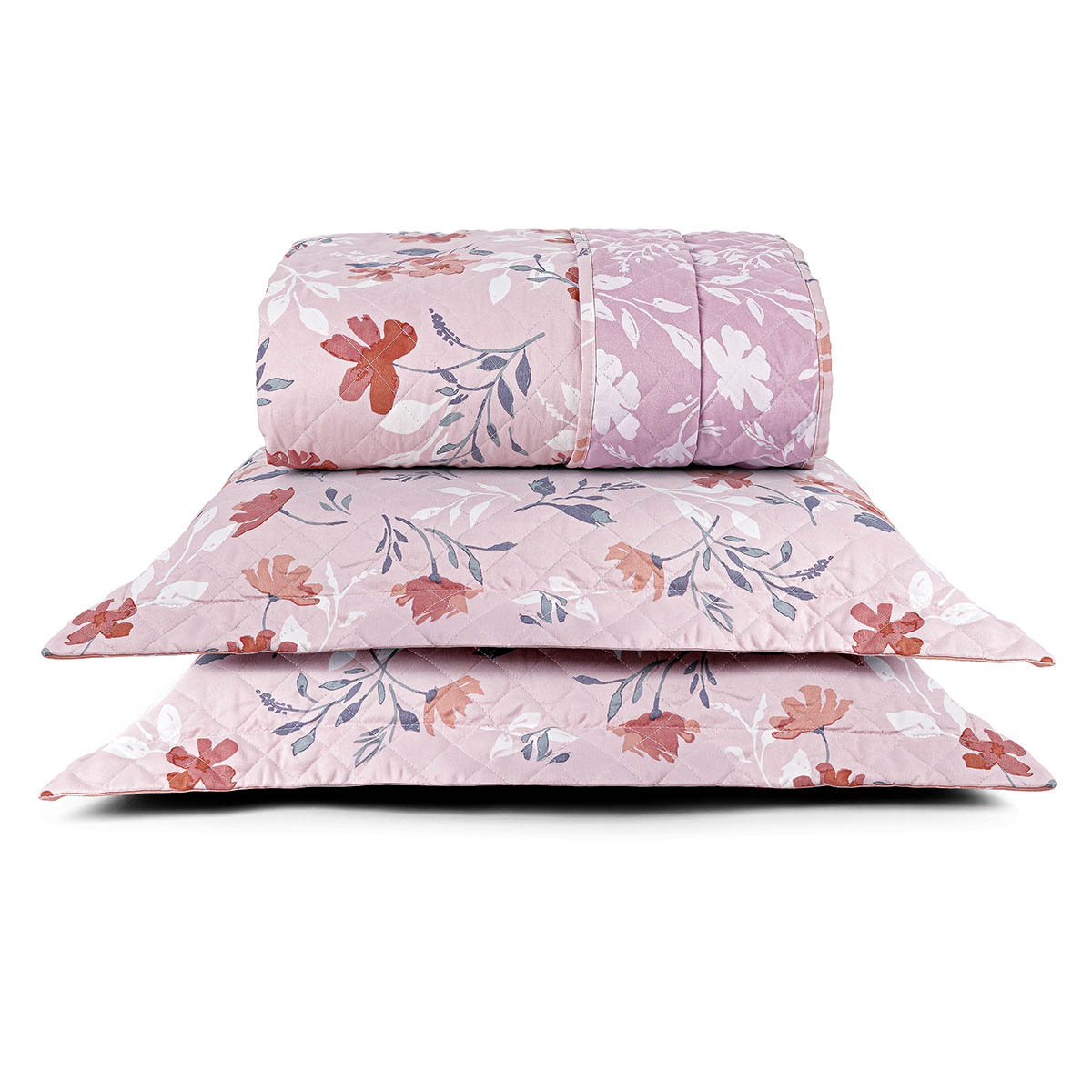 Kit Cobre Leito Colcha Belle Casal Padrão Estampado Dupla Face 400 Fios 3 Peças Floral Rosê