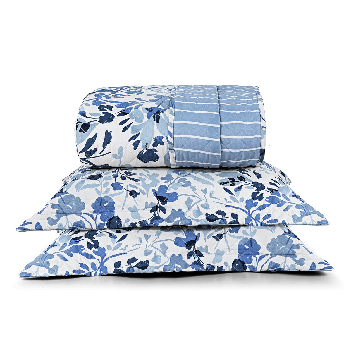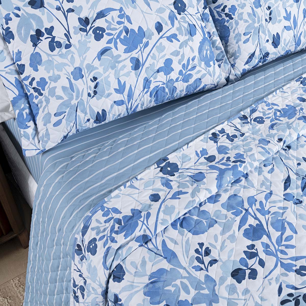 Kit Cobre Leito Colcha Belle Casal Padrão Estampado Dupla Face 400 Fios 3 Peças Florido Azul