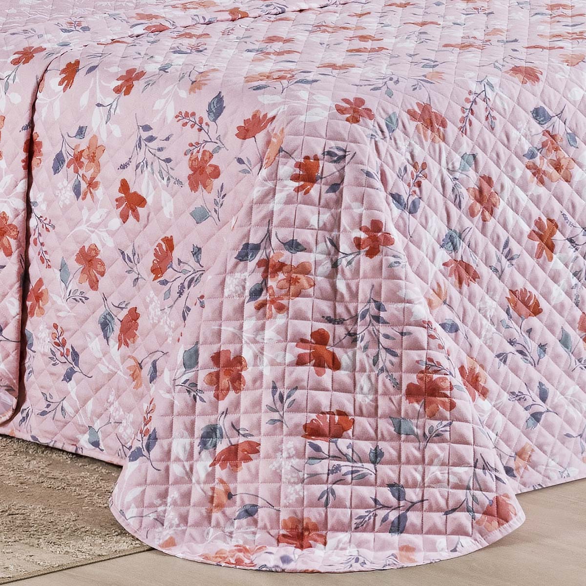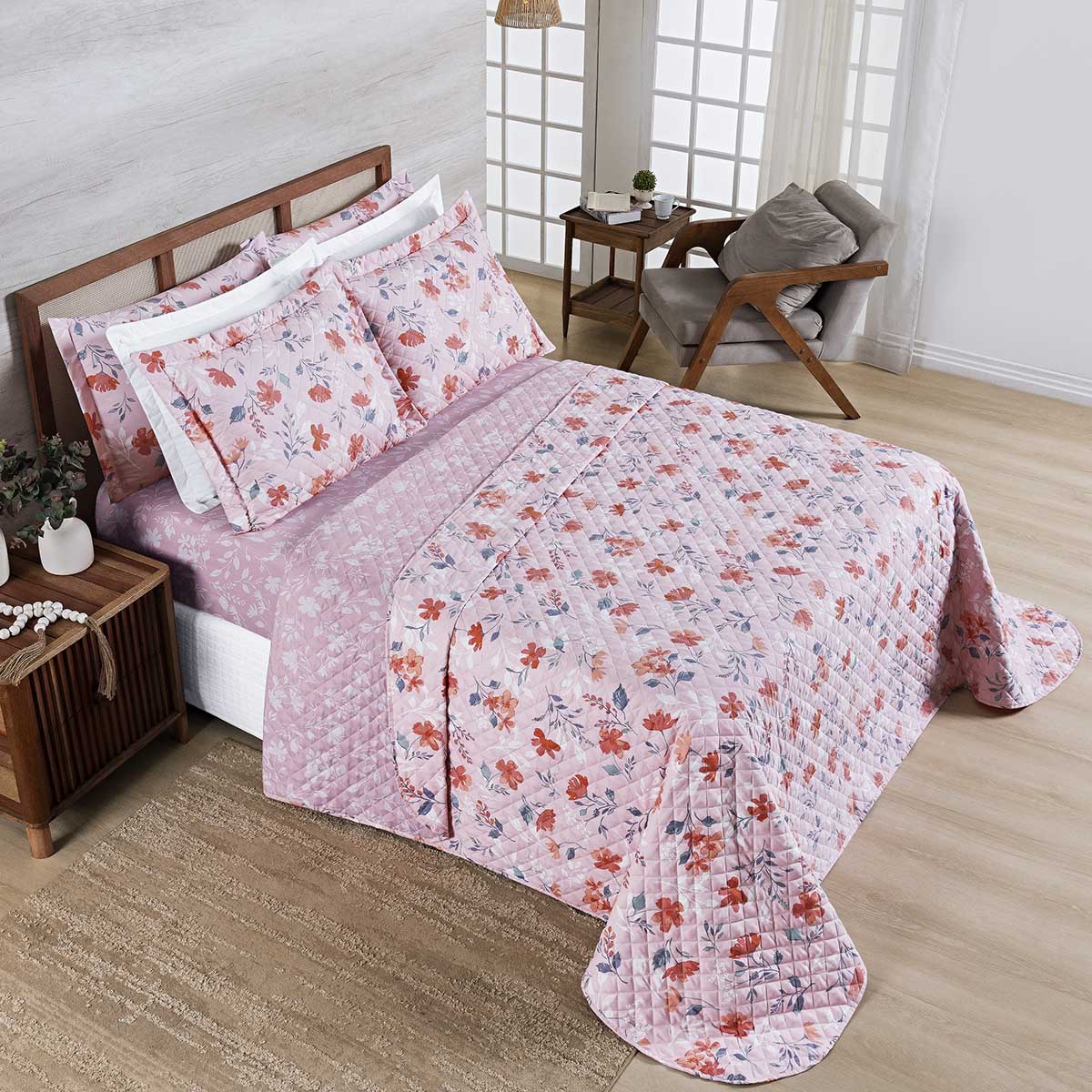 Kit Cobre Leito Colcha Belle King Estampado Dupla Face 400 Fios 3 Peças Floral Rosê