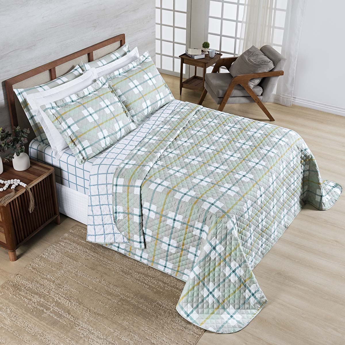 Kit Cobre Leito Colcha Belle King Estampado Dupla Face 400 Fios 3 Peças Grid Verde
