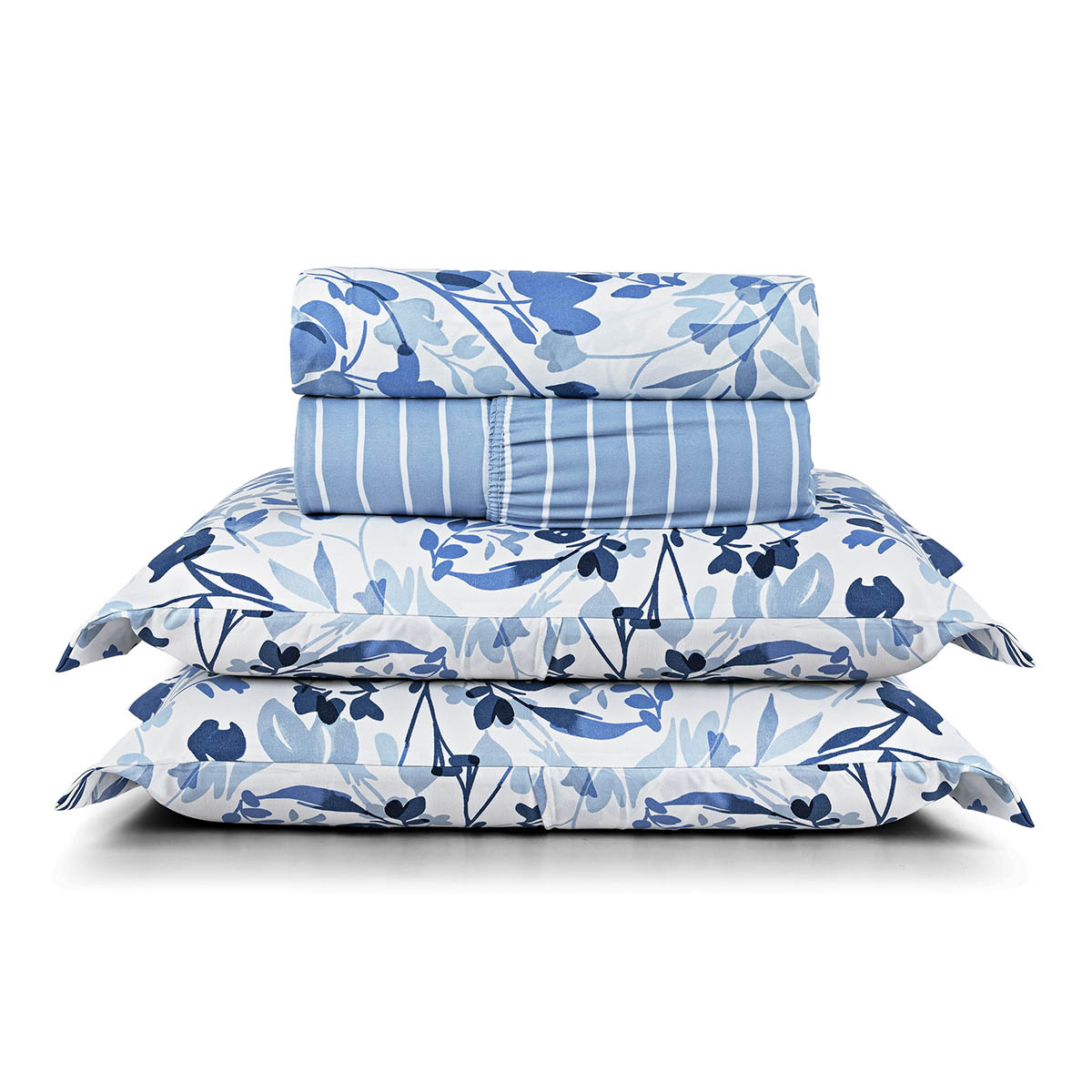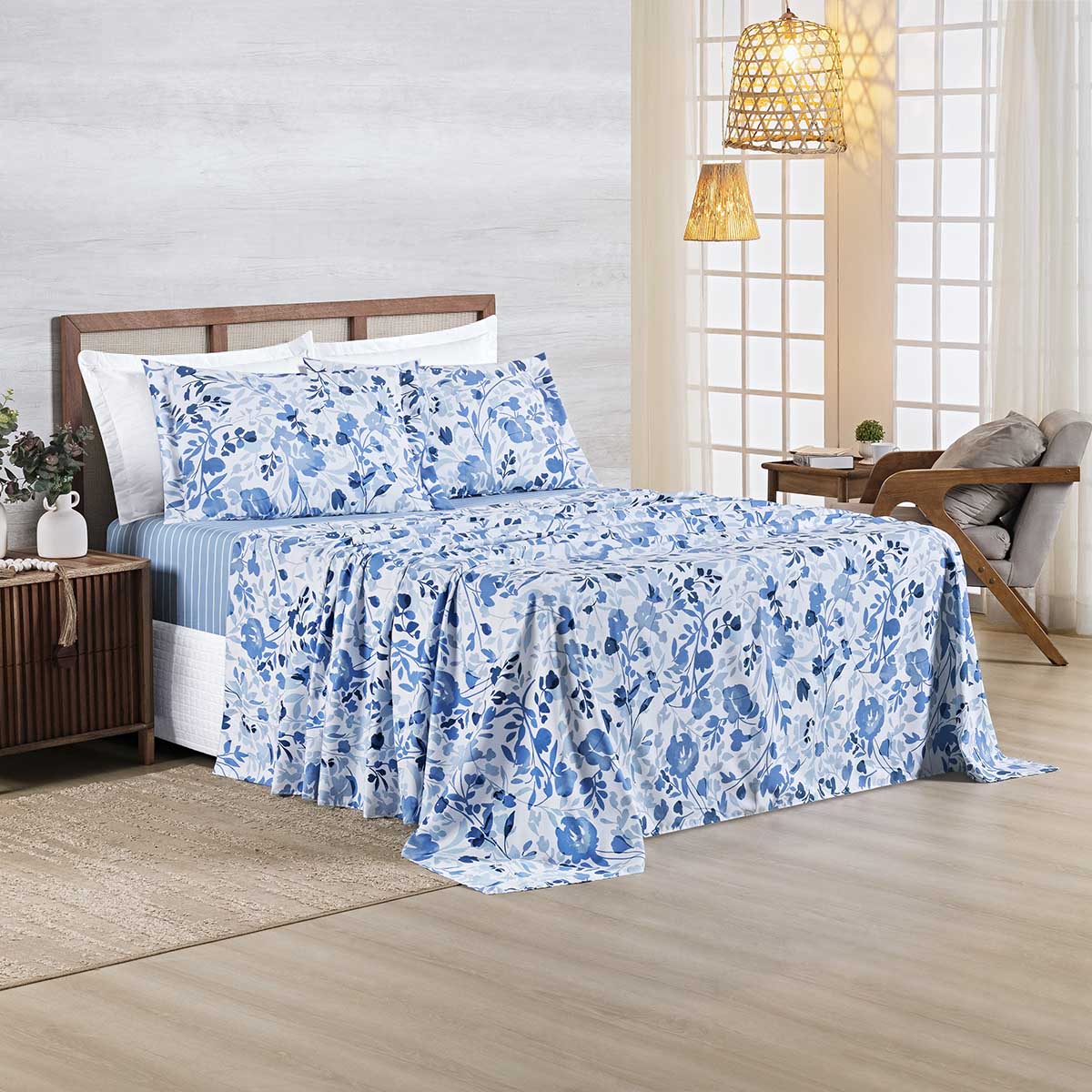 Jogo Cama Lençol Belle Casal Padrão 400 Fios Estampado 4 Peças Florido Azul