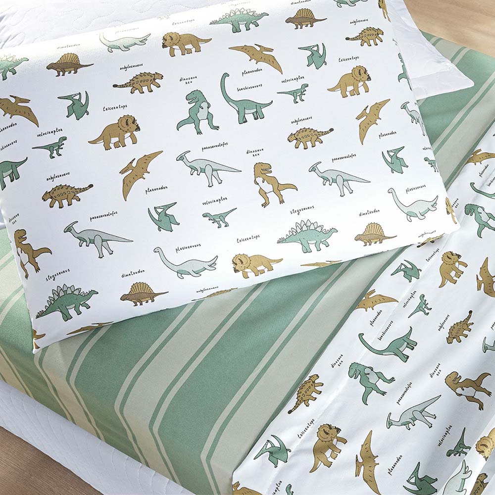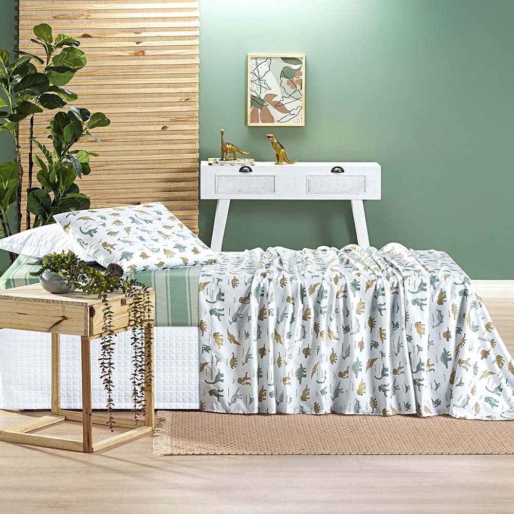 Jogo de Cama Lençol Lutti Solteiro Infantil 200 Fios Estampado 3 Peças Dinossauro Verde