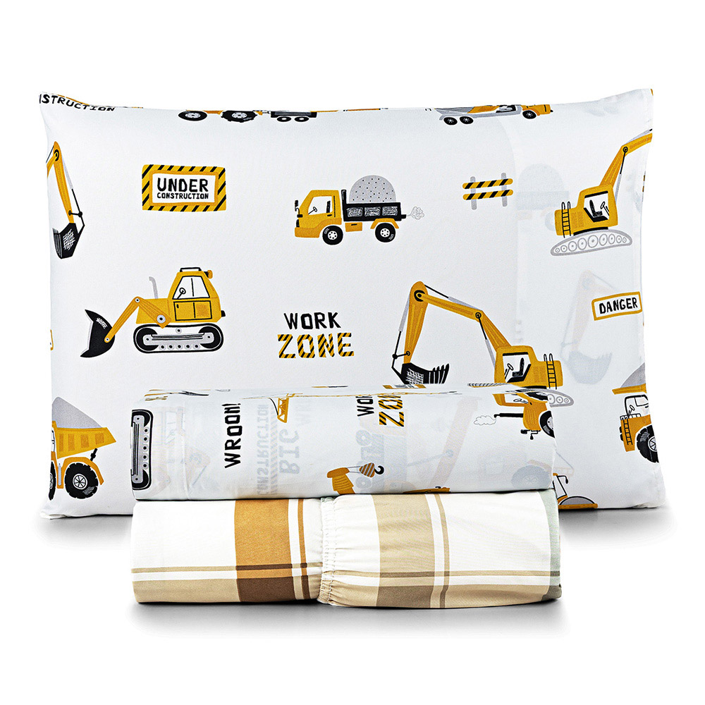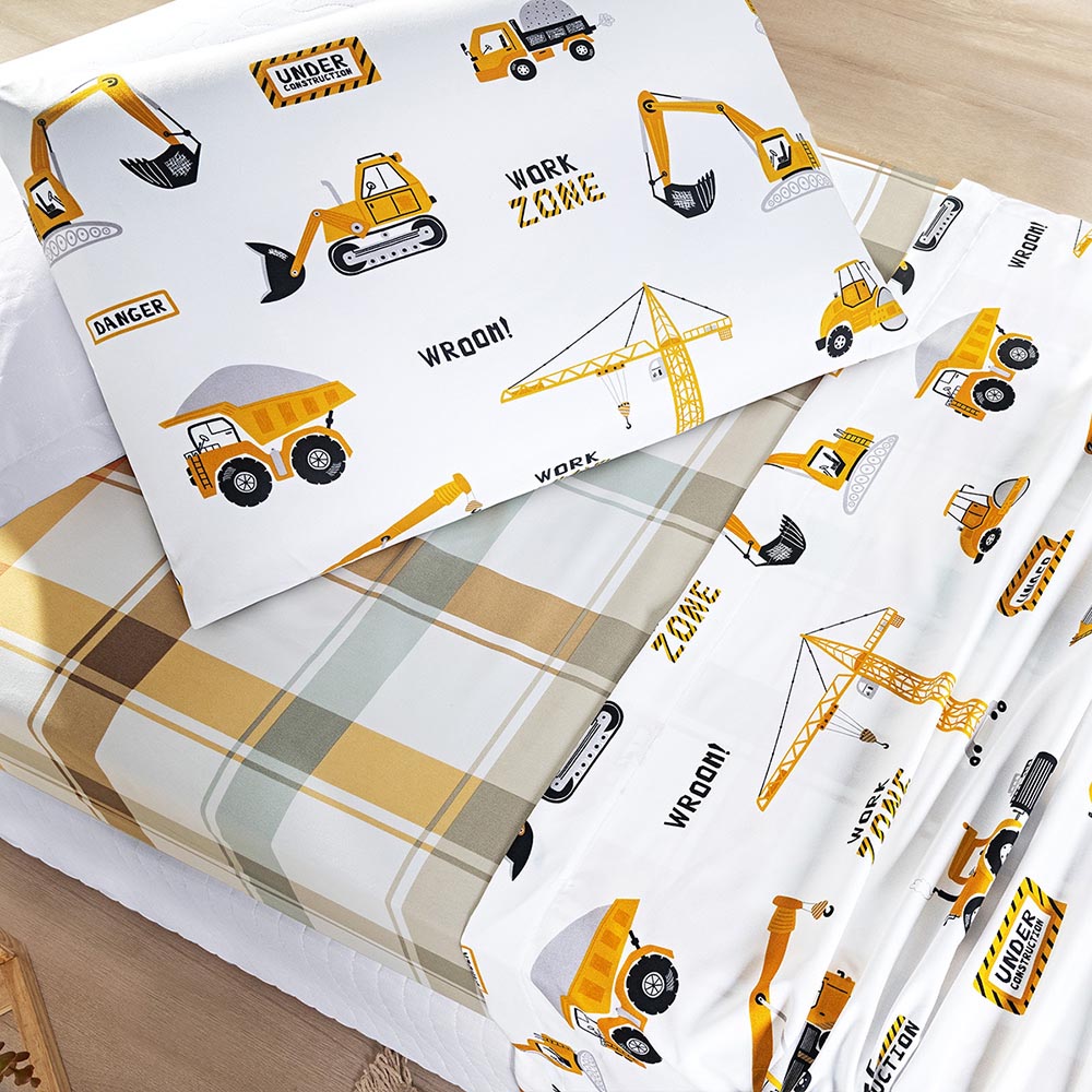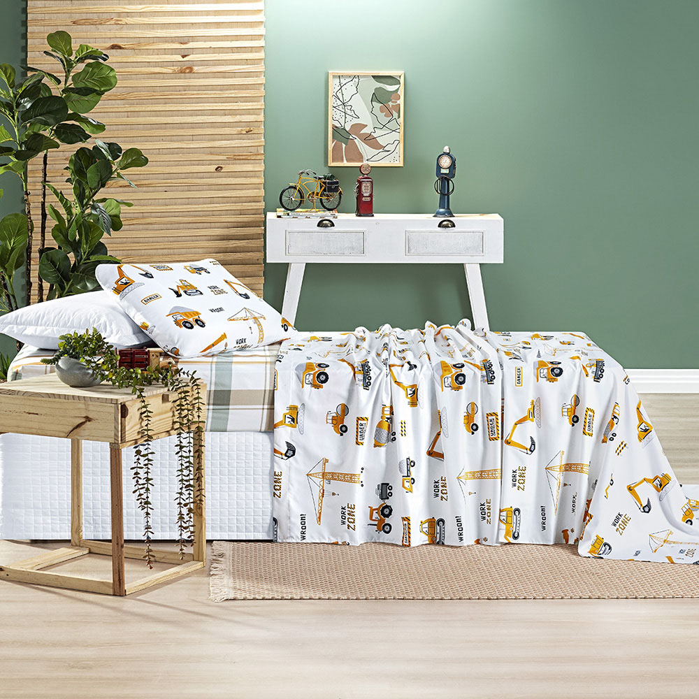 Jogo de Cama Lençol Lutti Solteiro Infantil 200 Fios Estampado 3 Peças Trator Caminhão Branco