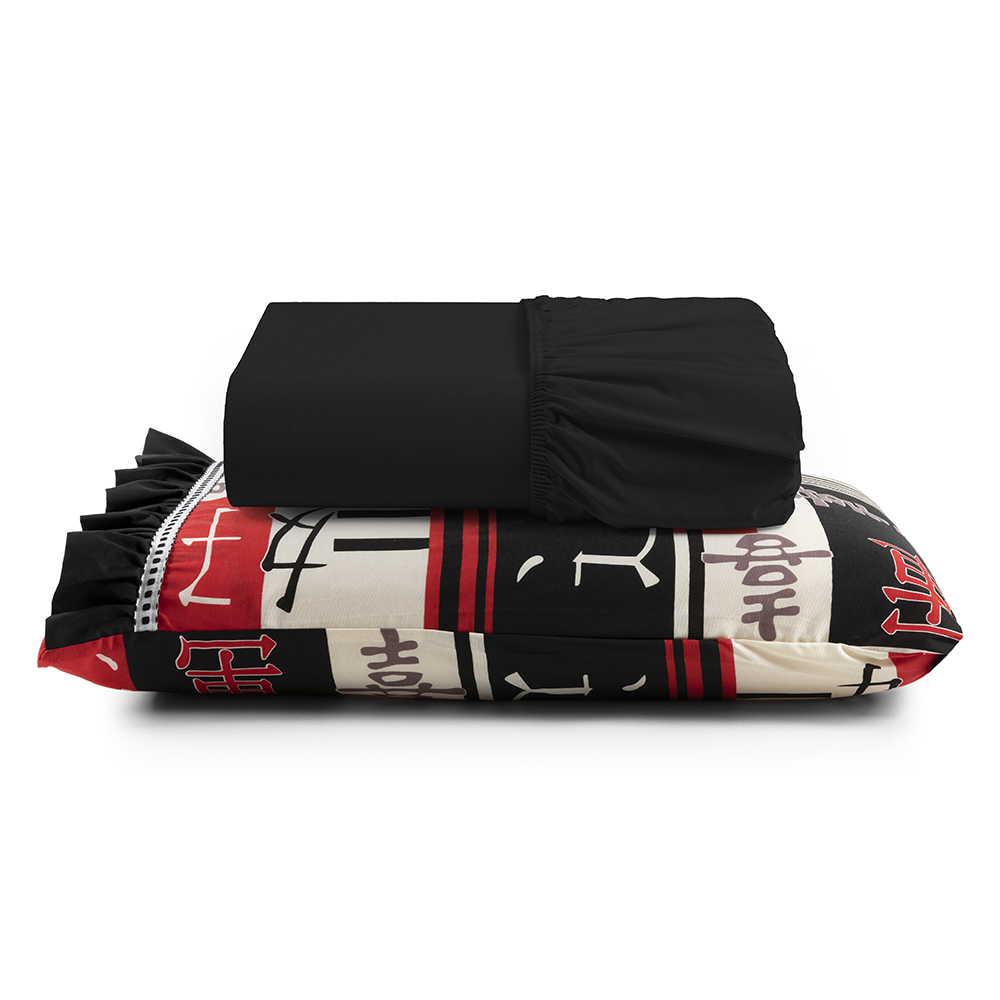 Jogo Cama Lençol Fiore Solteiro Estampado 180 Fios 100% Algodão com Babadinho 2 Peças Preto Oriental Japonês