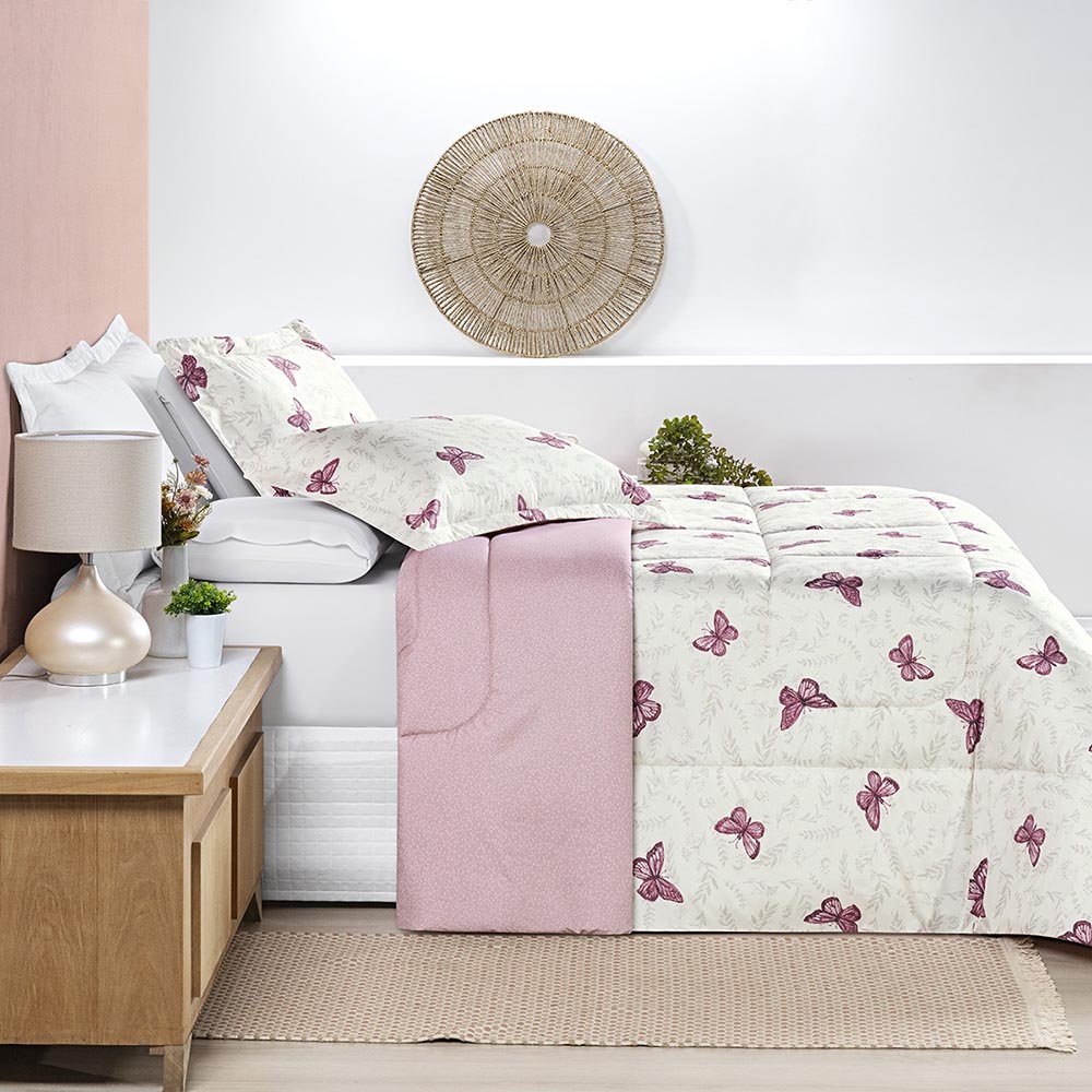 Kit Edredom Cobertor Celi King Dupla Face Micropercal Estampado 200 Fios 3 Peças Borboletas Rosê - 100% Poliéster