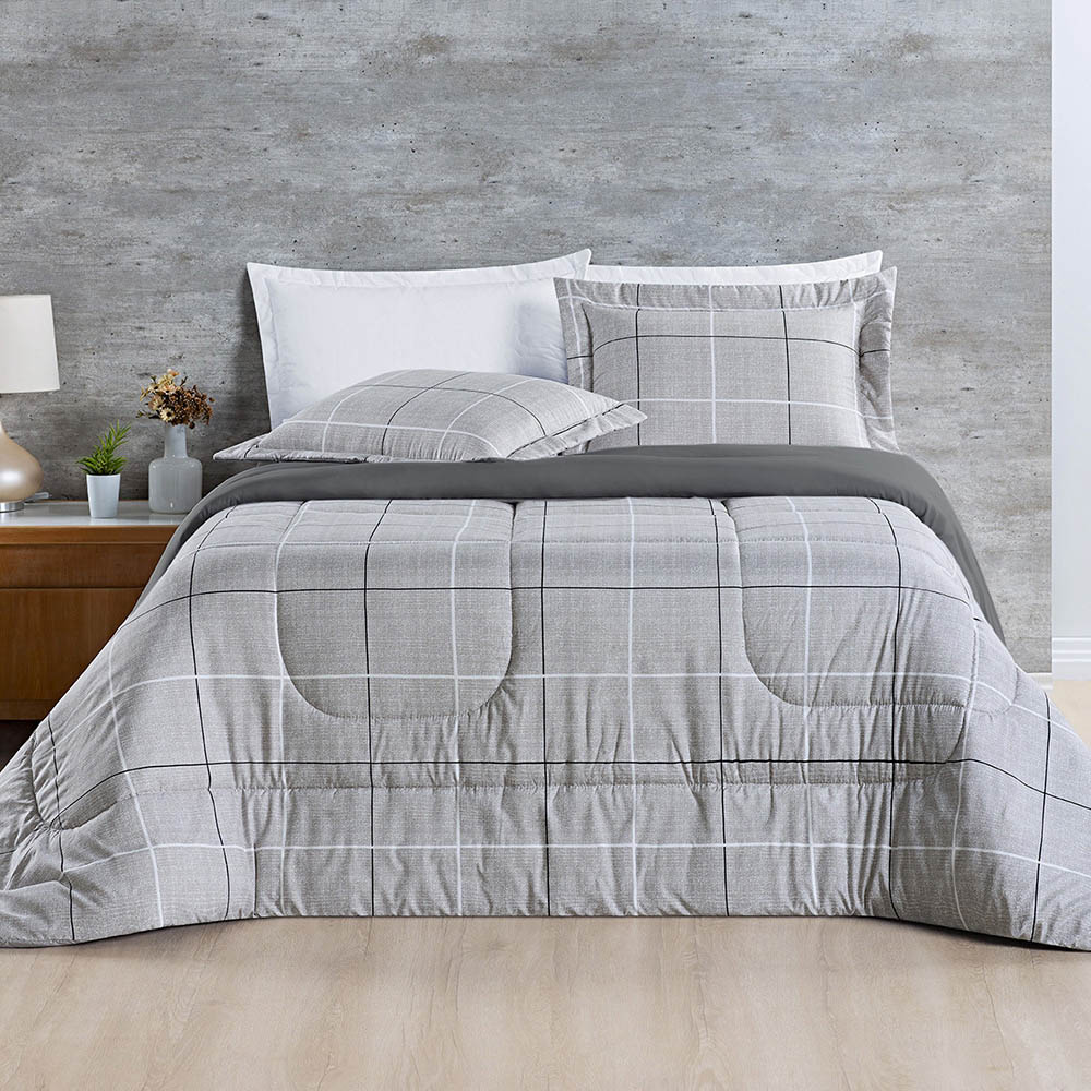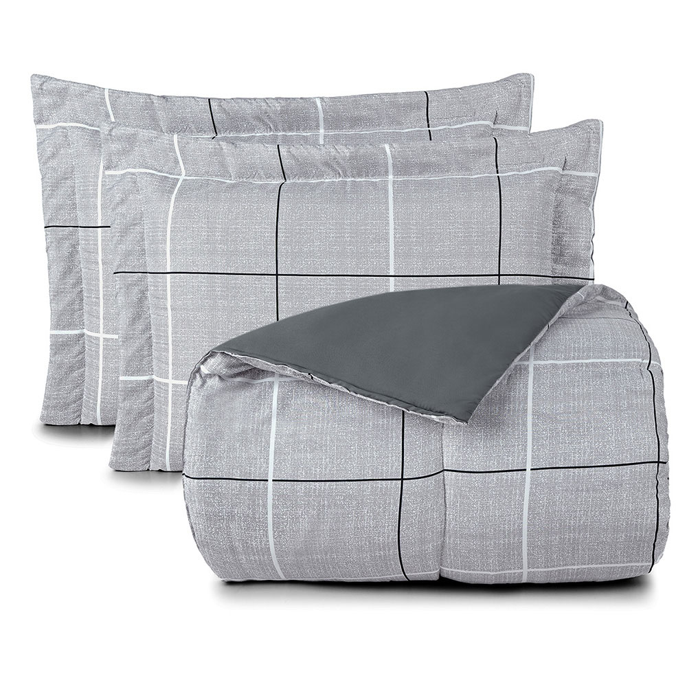 Kit Edredom Cobertor Celi King Dupla Face Micropercal Estampado 200 Fios 3 Peças Xadrez Grid Cinza - 100% Poliéster