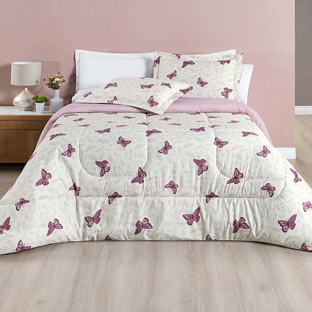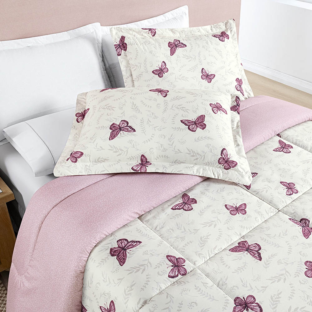 Kit Edredom Cobertor Celi Super King Dupla Face Micropercal Estampado 200 Fios 3 Peças Borboletas Rosê - 100% Poliéster