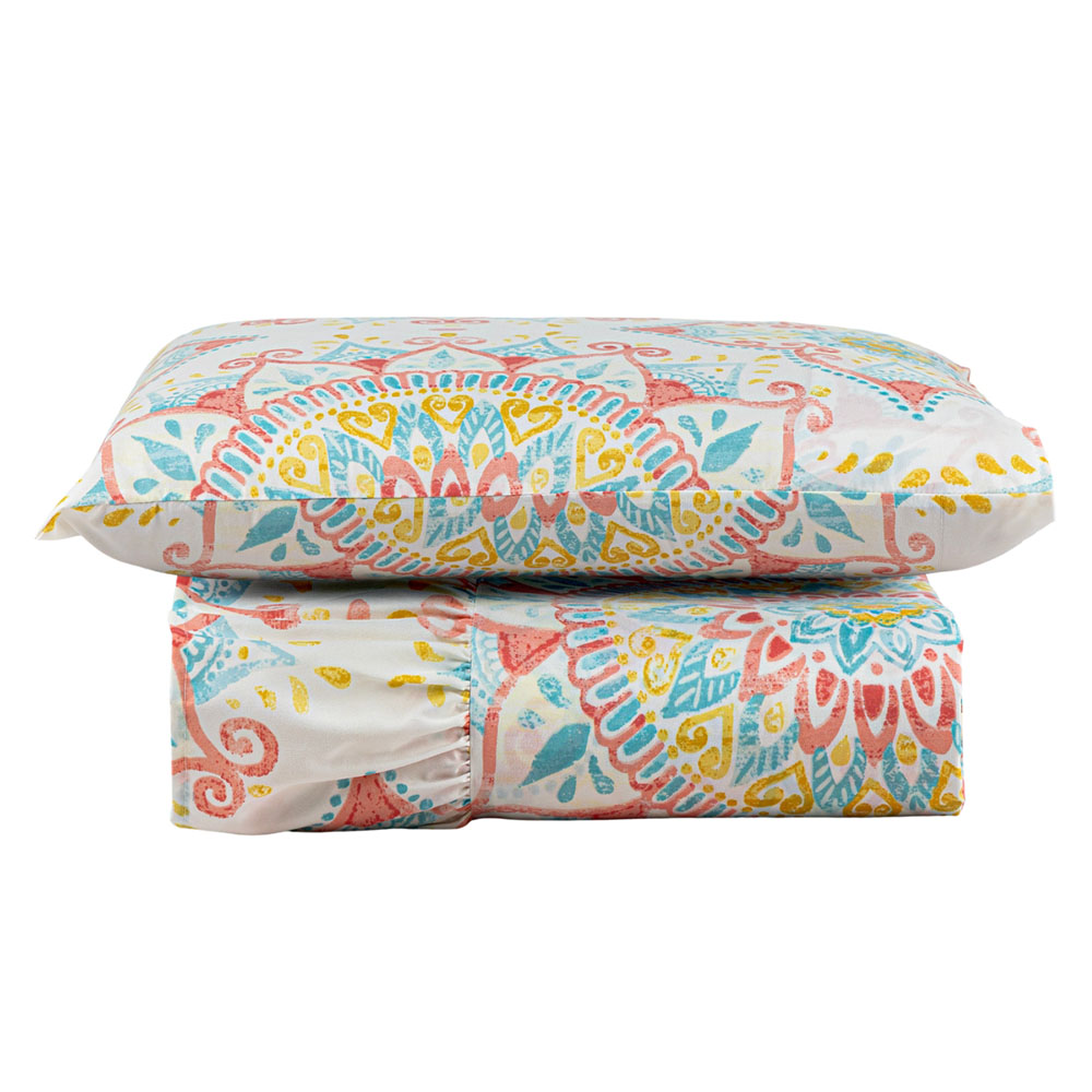 Kit Cobre Leito Colcha Turin Solteiro Estampada c/ Babado 400 Fios 2 Peças Mandala Vermelha Bege